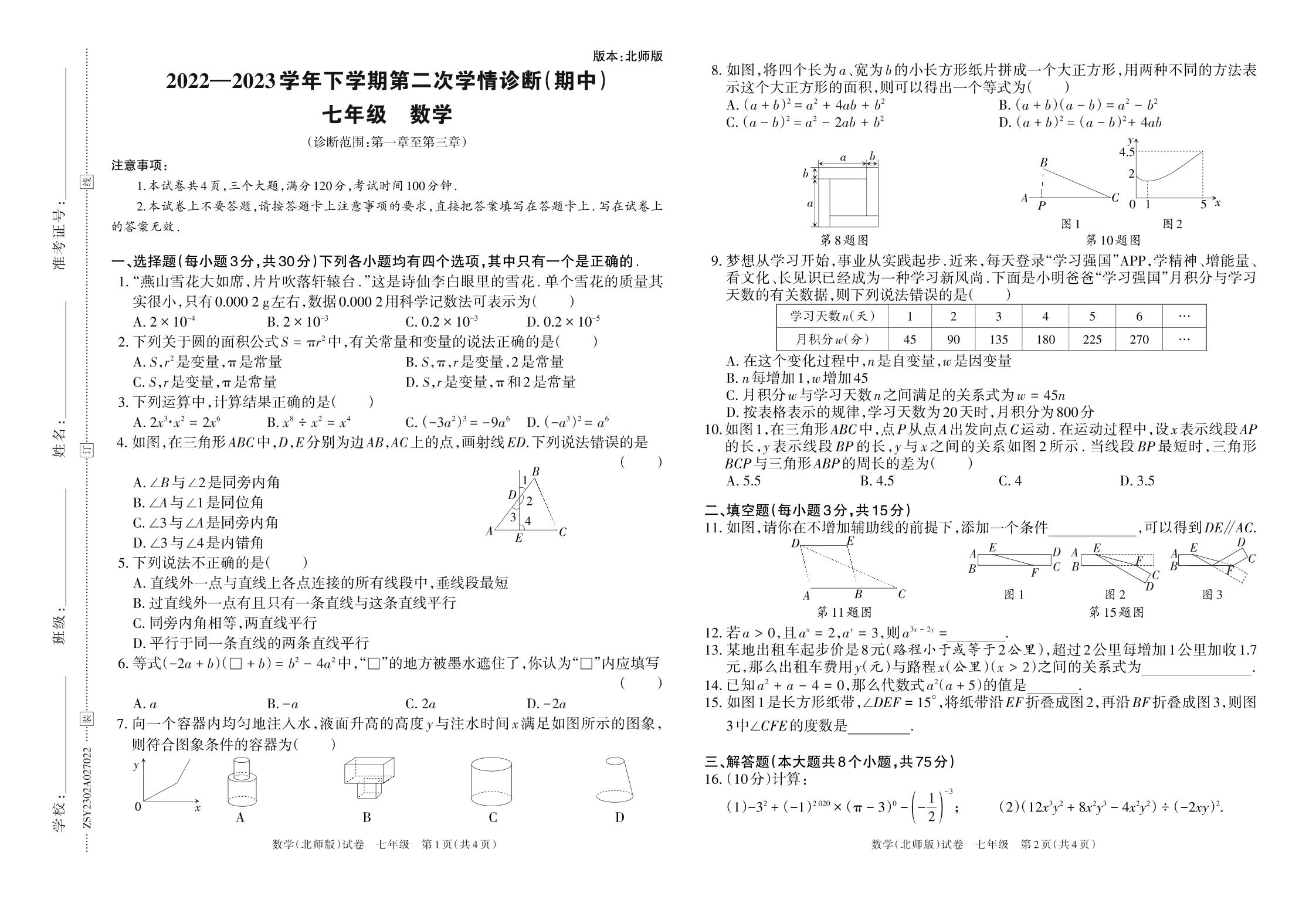 2022—2023学年下学期第二次学情诊断(期中)试卷七年级数学(北师版)