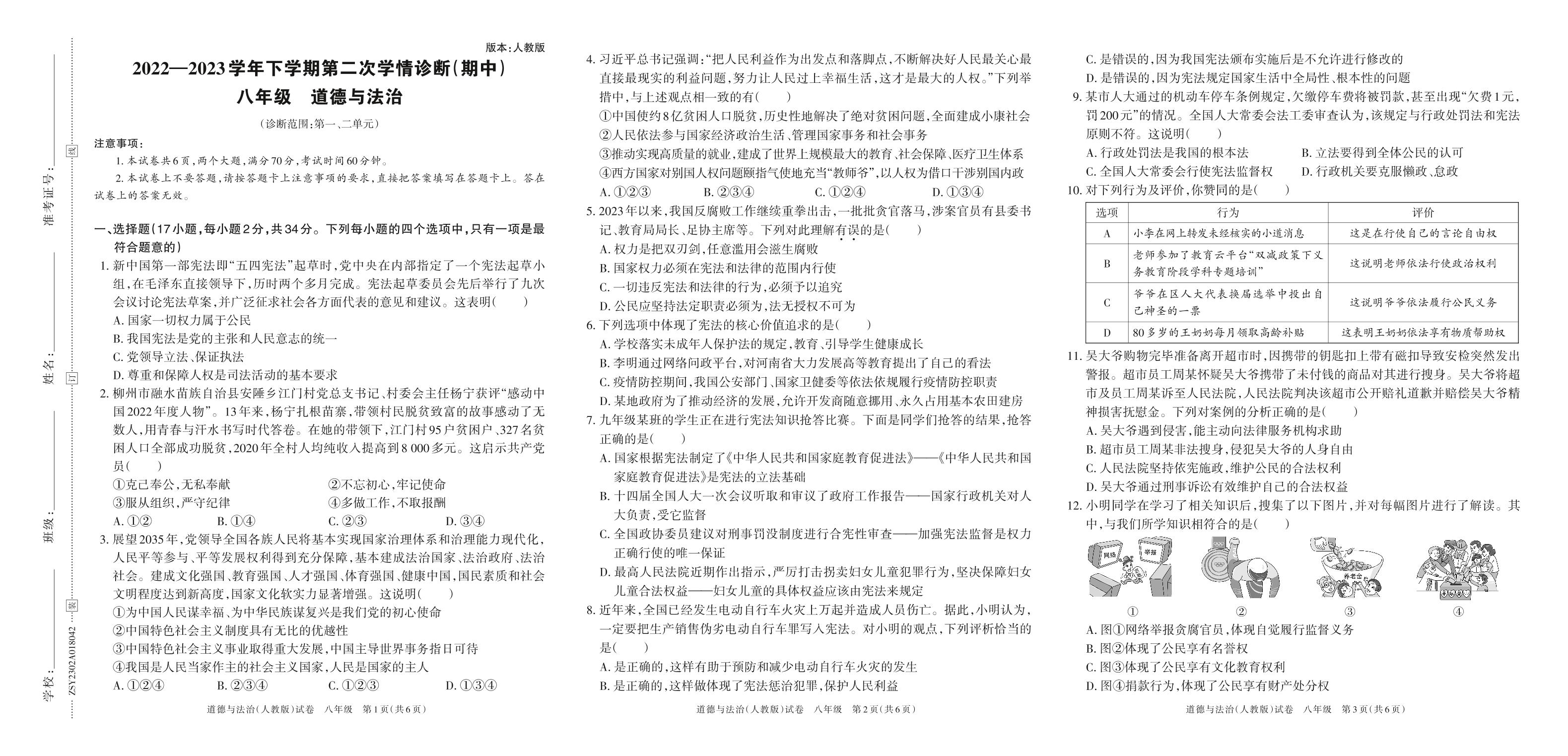2022—2023学年下学期第二次学情诊断(期中)A卷八年级道德与法治(人教版)
