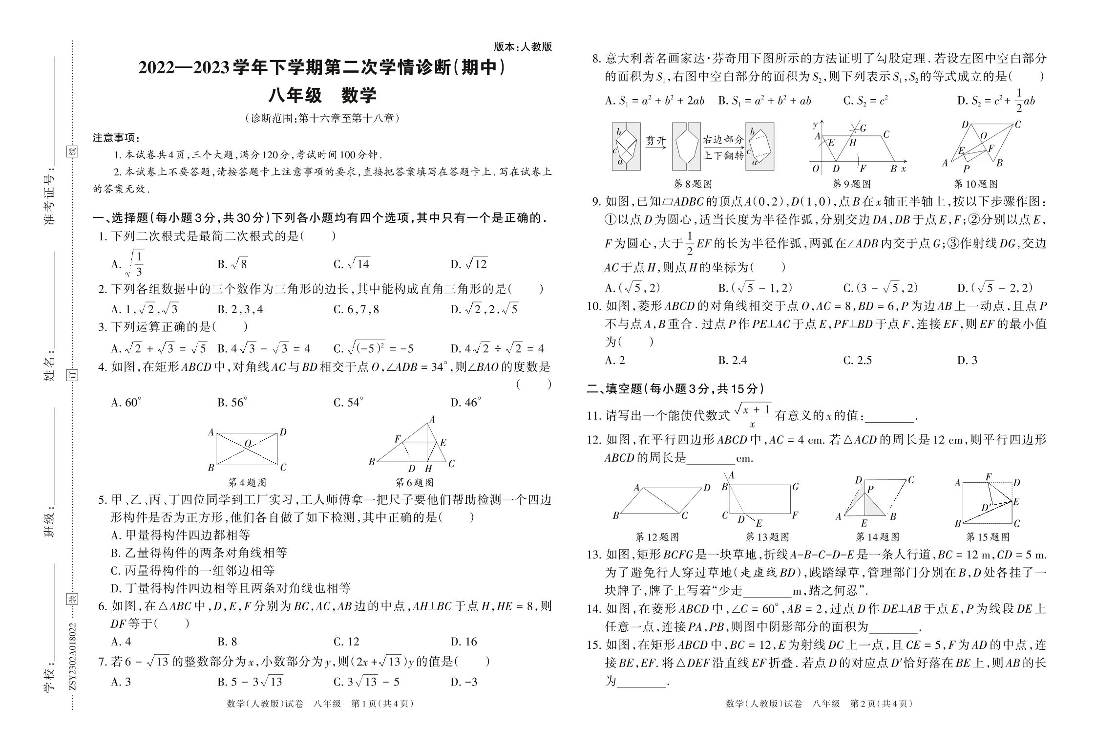 2022—2023学年下学期第二次学情诊断(期中)A卷八年级数学(人教版)