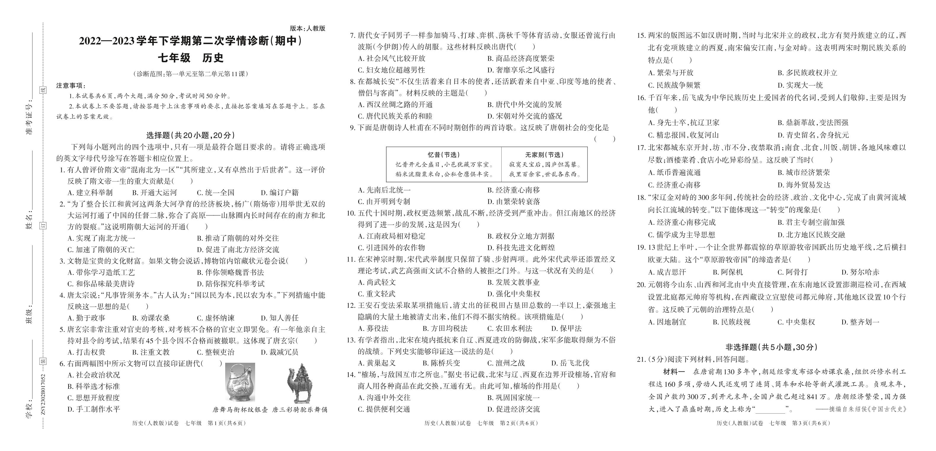 2022—2023学年下学期第二次学情诊断(期中)B卷七年级历史(人教版)