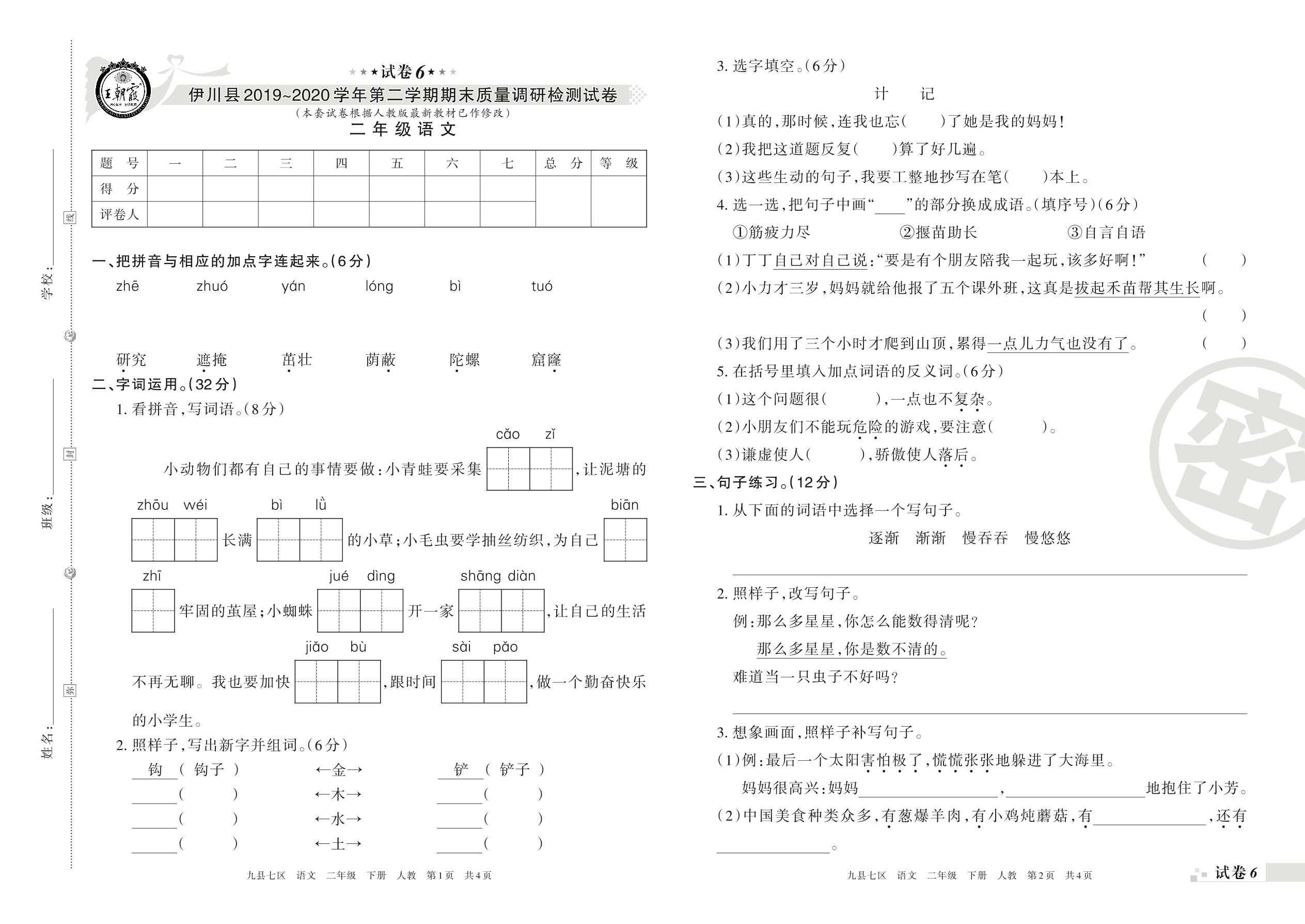 2019-2020学年第二学期洛阳市伊川县二年级语文试卷(人教版)【6】
