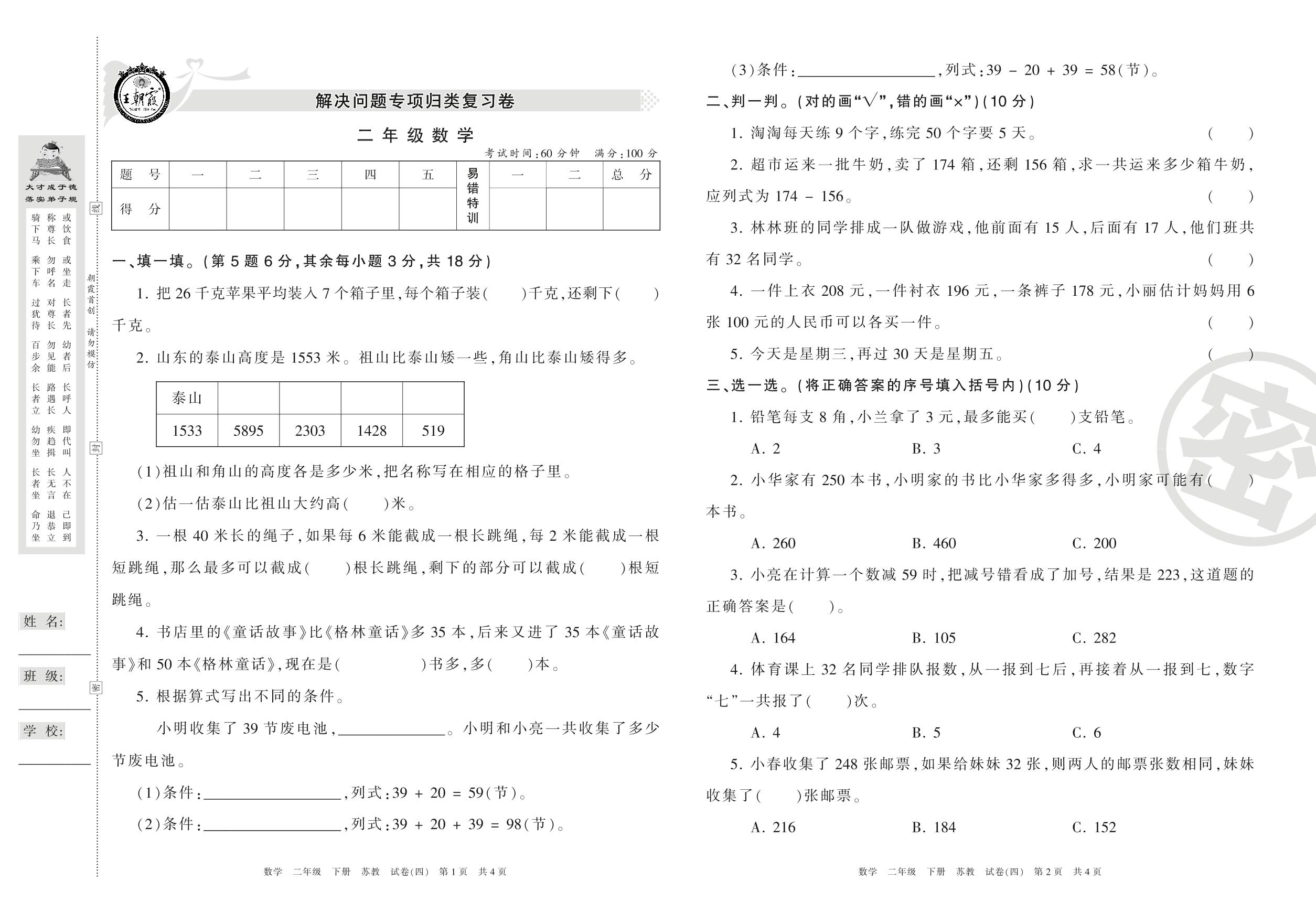 二年级数学苏教版下册专项卷