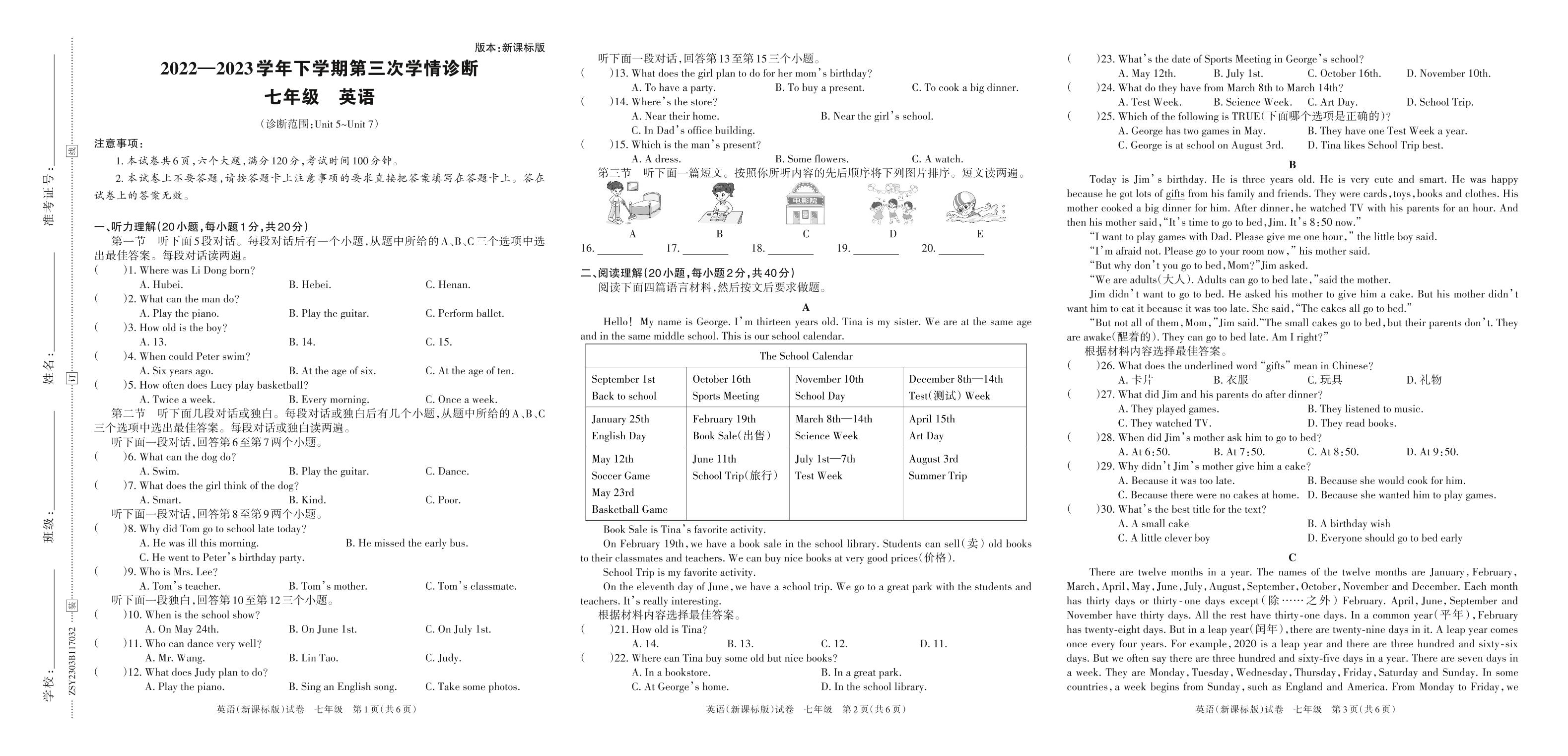 2022—2023学年下学期第三次学情诊断B卷七年级英语(新课标版)