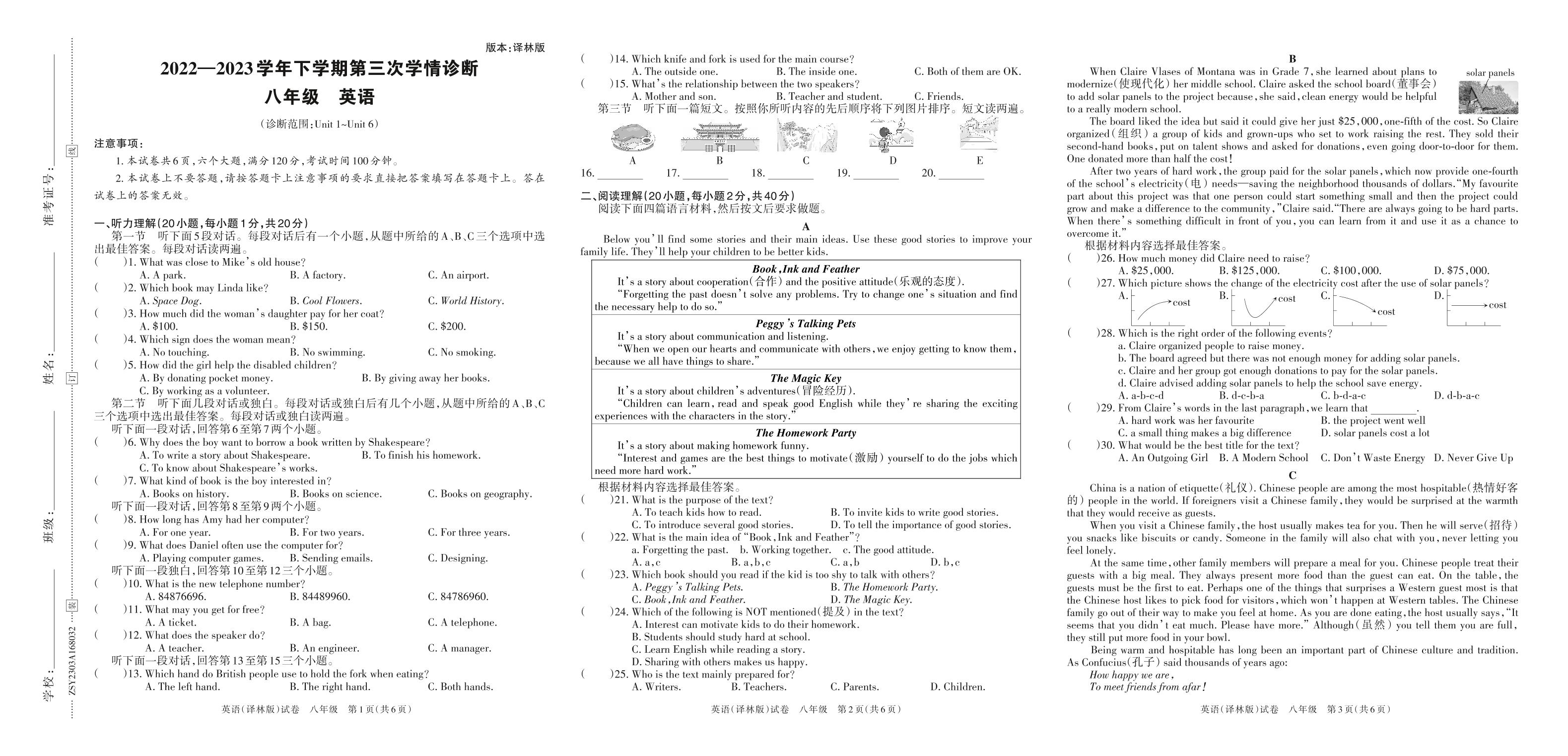 2022—2023学年下学期第三次学情诊断试卷八年级英语(译林版)