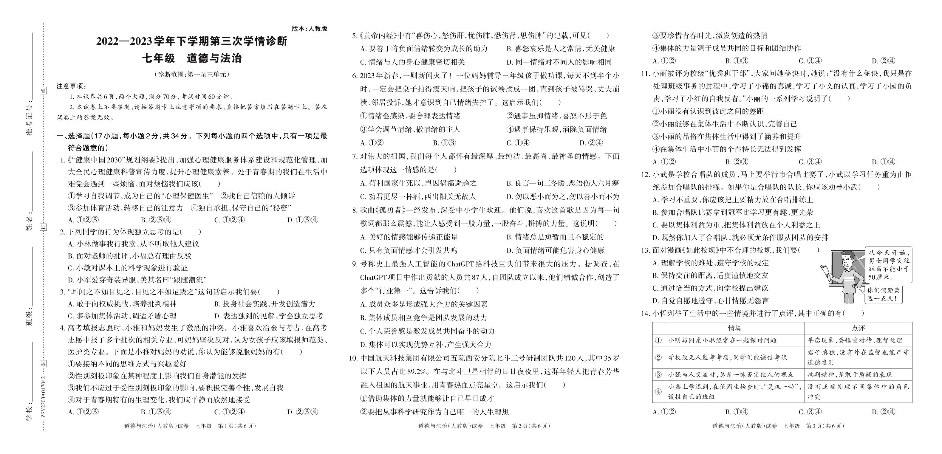 2022—2023学年下学期第三次学情诊断A卷七年级道德与法治(人教版)