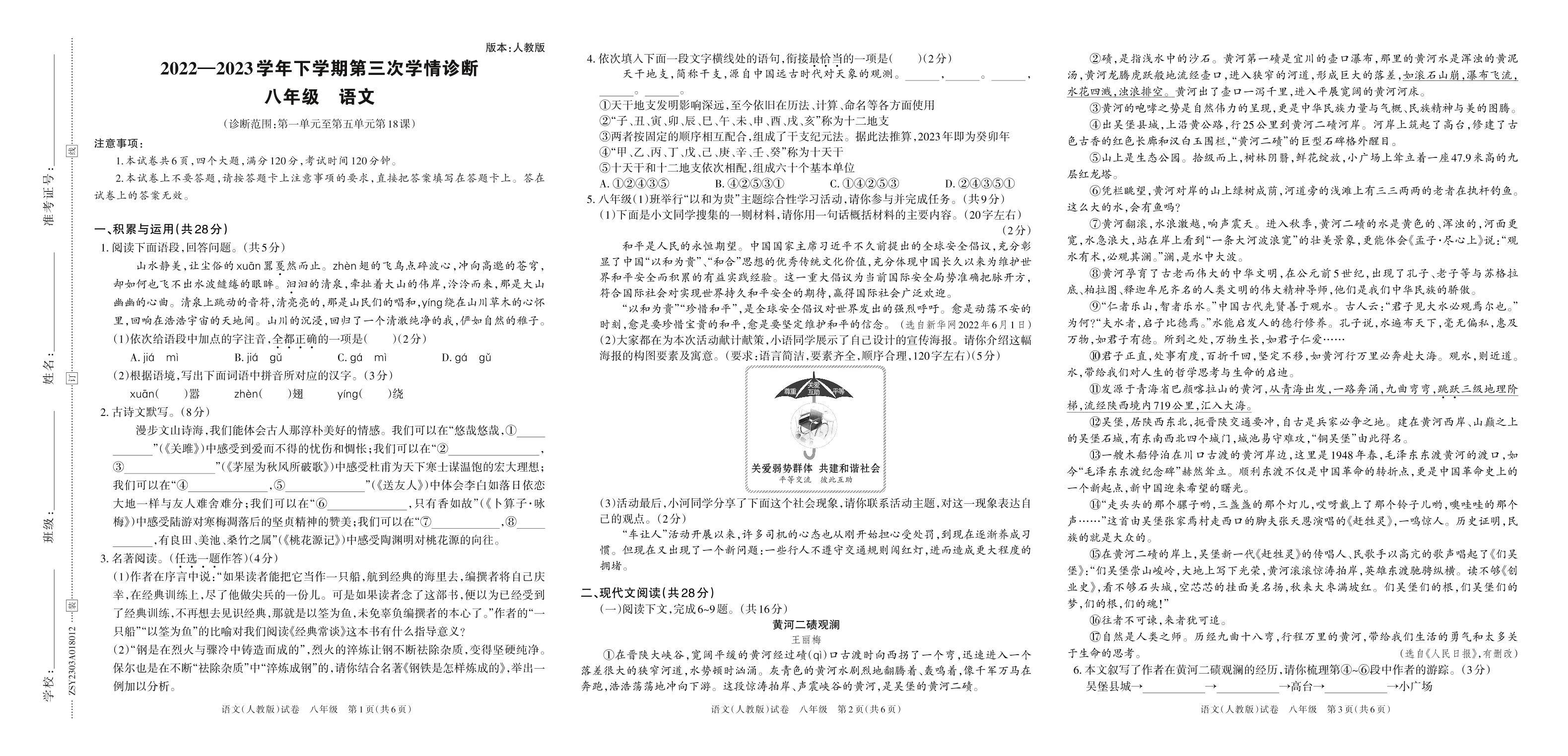 2022—2023学年下学期第三次学情诊断A卷八年级语文(人教版)