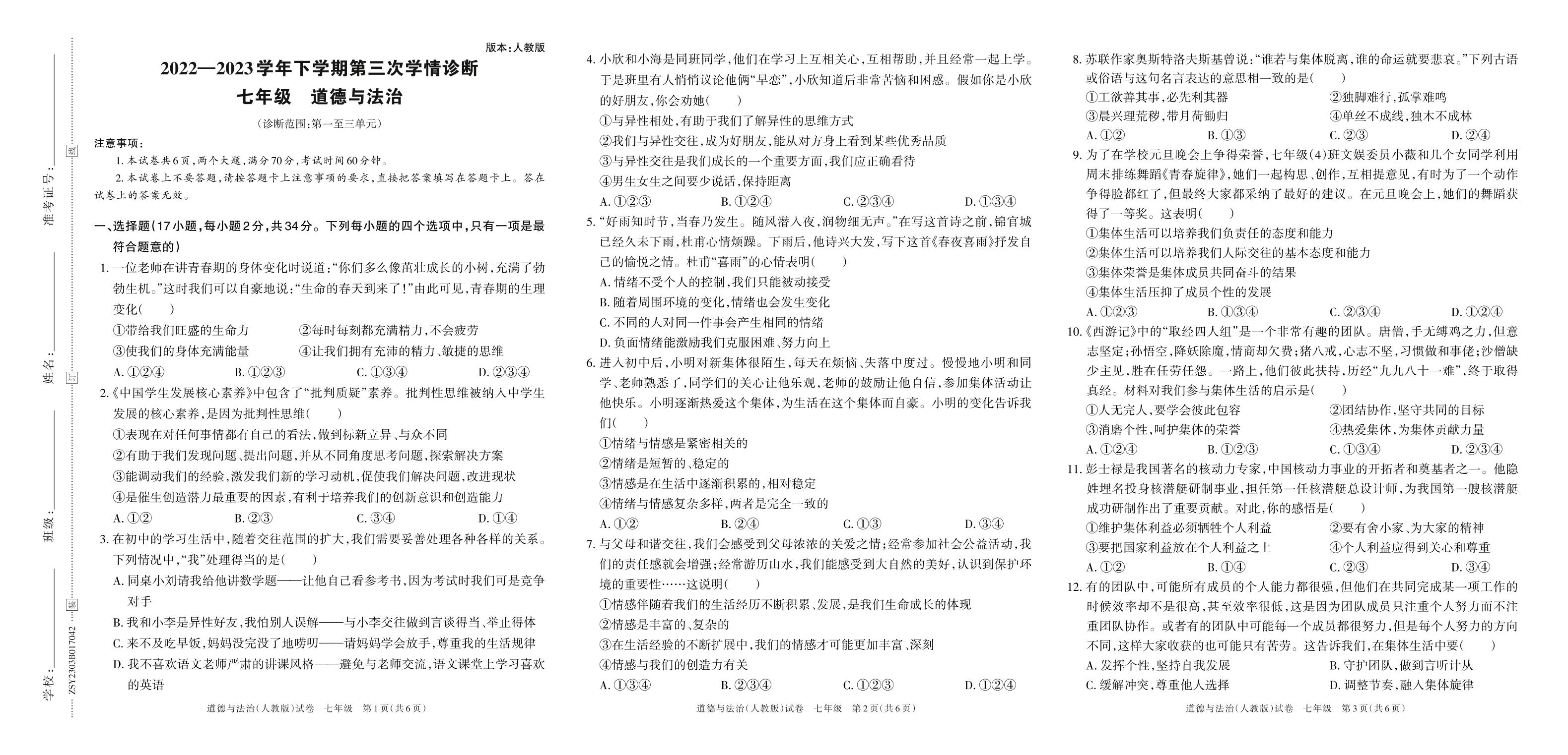 2022—2023学年下学期第三次学情诊断B卷七年级道德与法治(人教版)