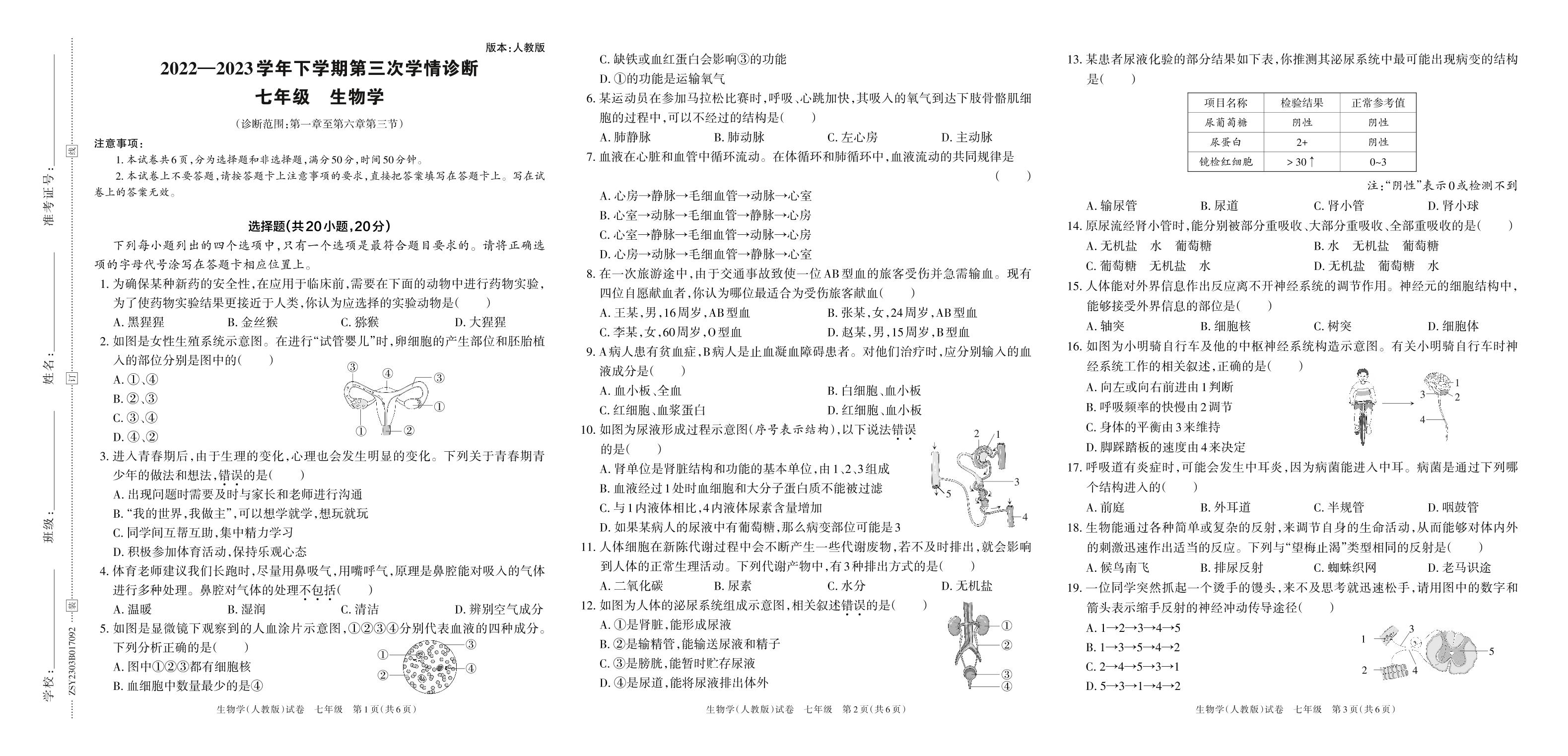 2022—2023学年下学期第三次学情诊断B卷七年级生物(人教版)