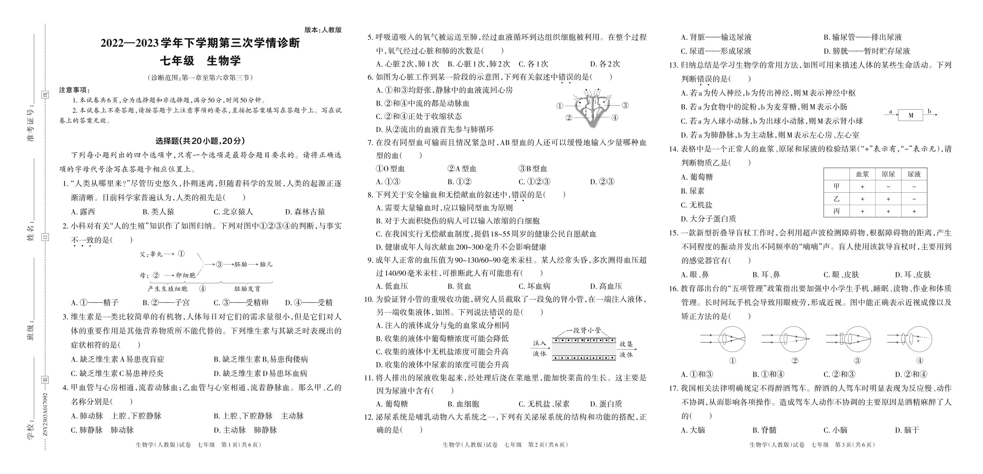 2022—2023学年下学期第三次学情诊断A卷七年级生物(人教版)