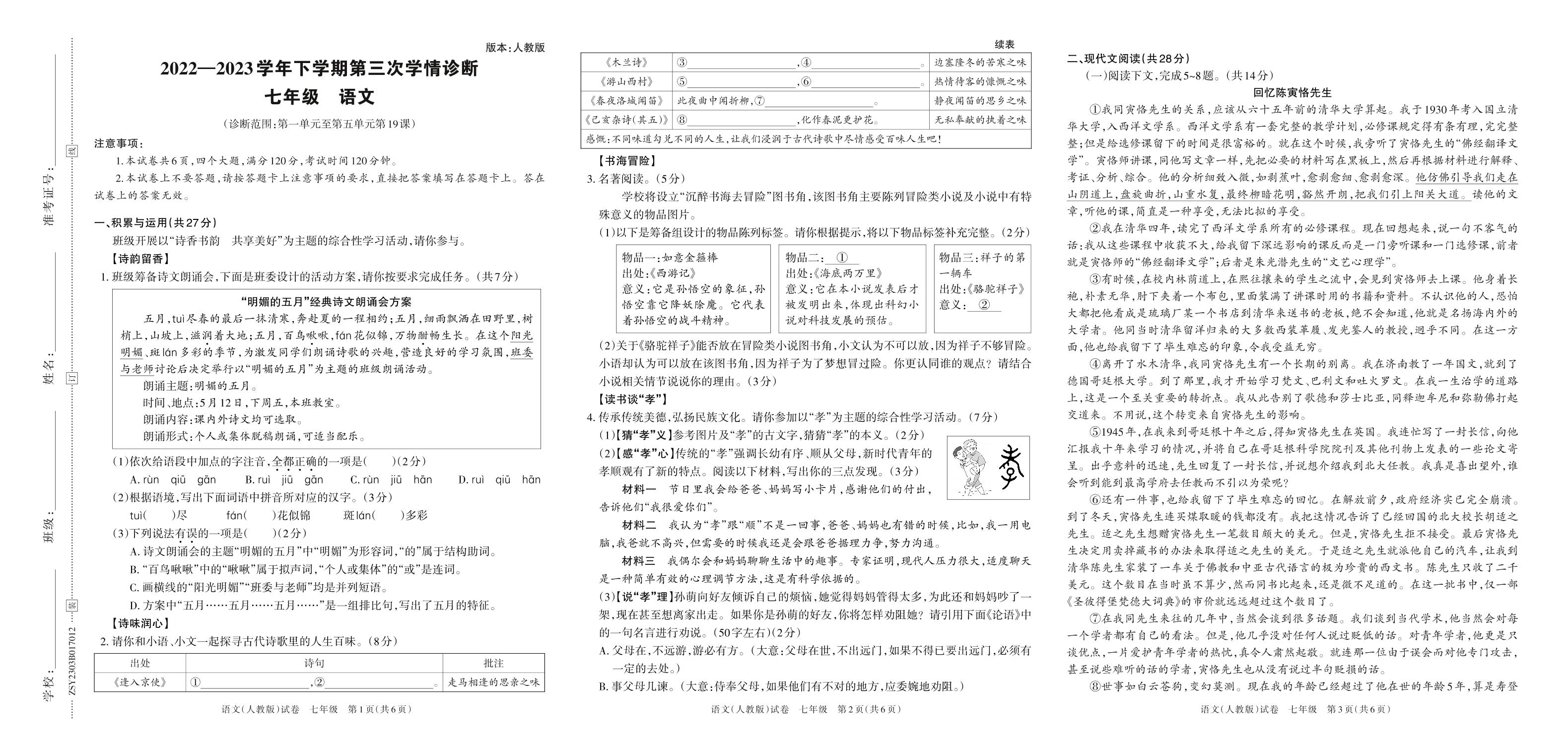 2022—2023学年下学期第三次学情诊断B卷七年级语文(人教版)