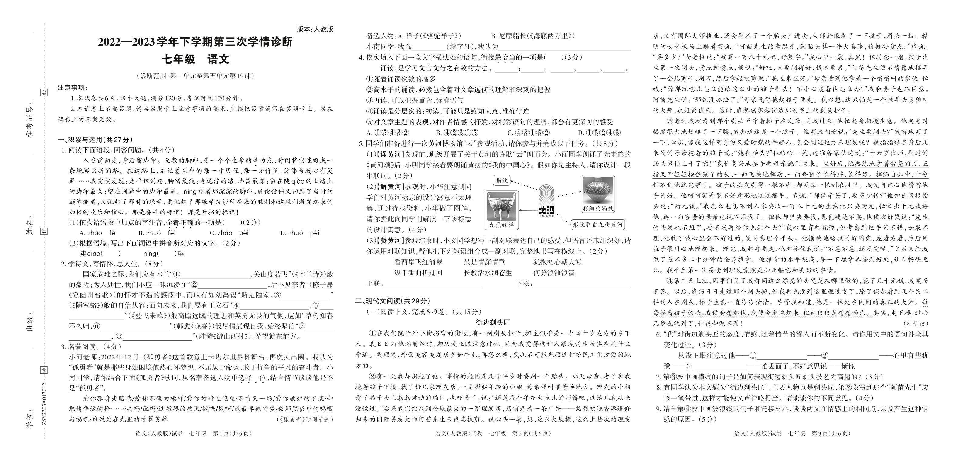2022—2023学年下学期第三次学情诊断A卷七年级语文(人教版)