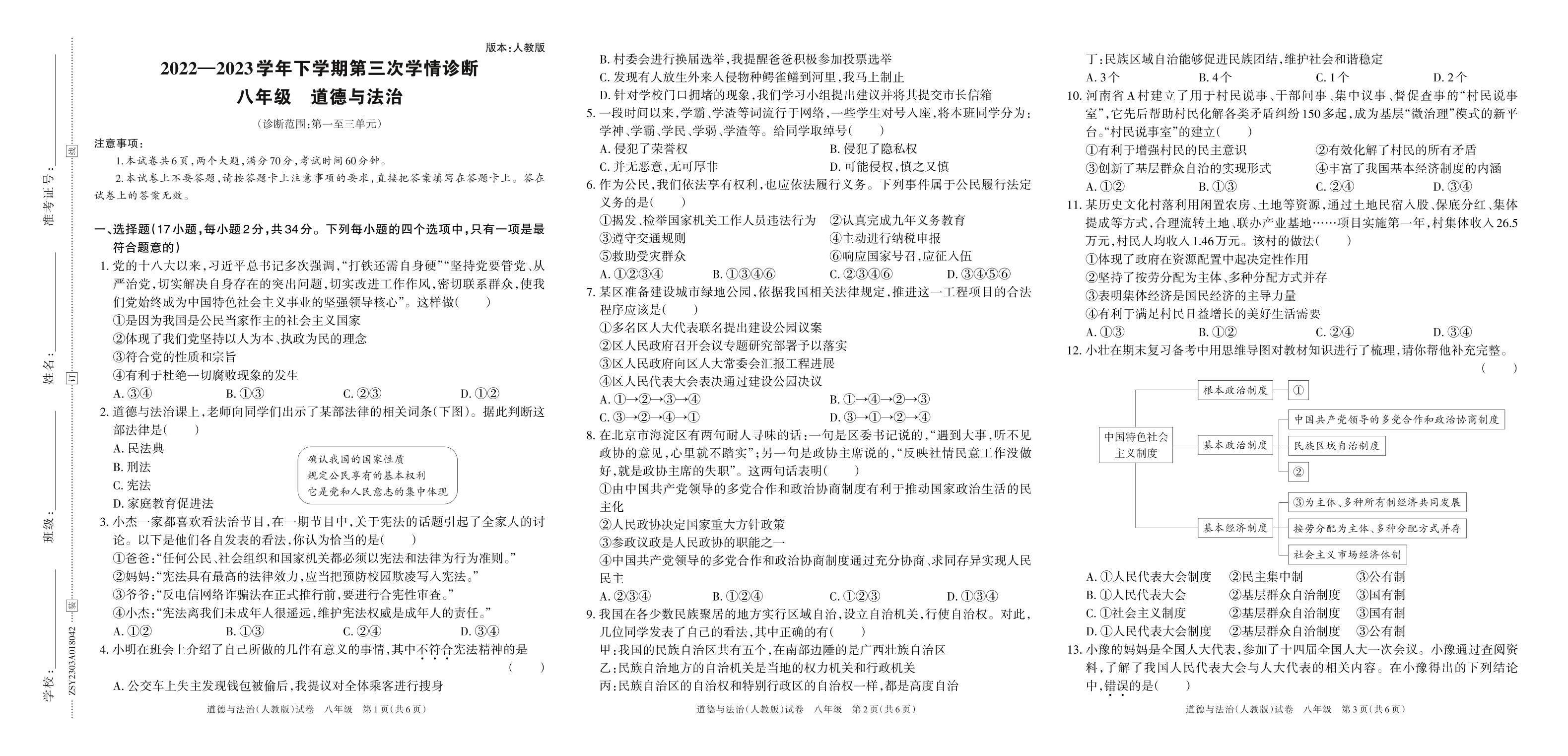 2022—2023学年下学期第三次学情诊断A卷八年级道德与法治(人教版)