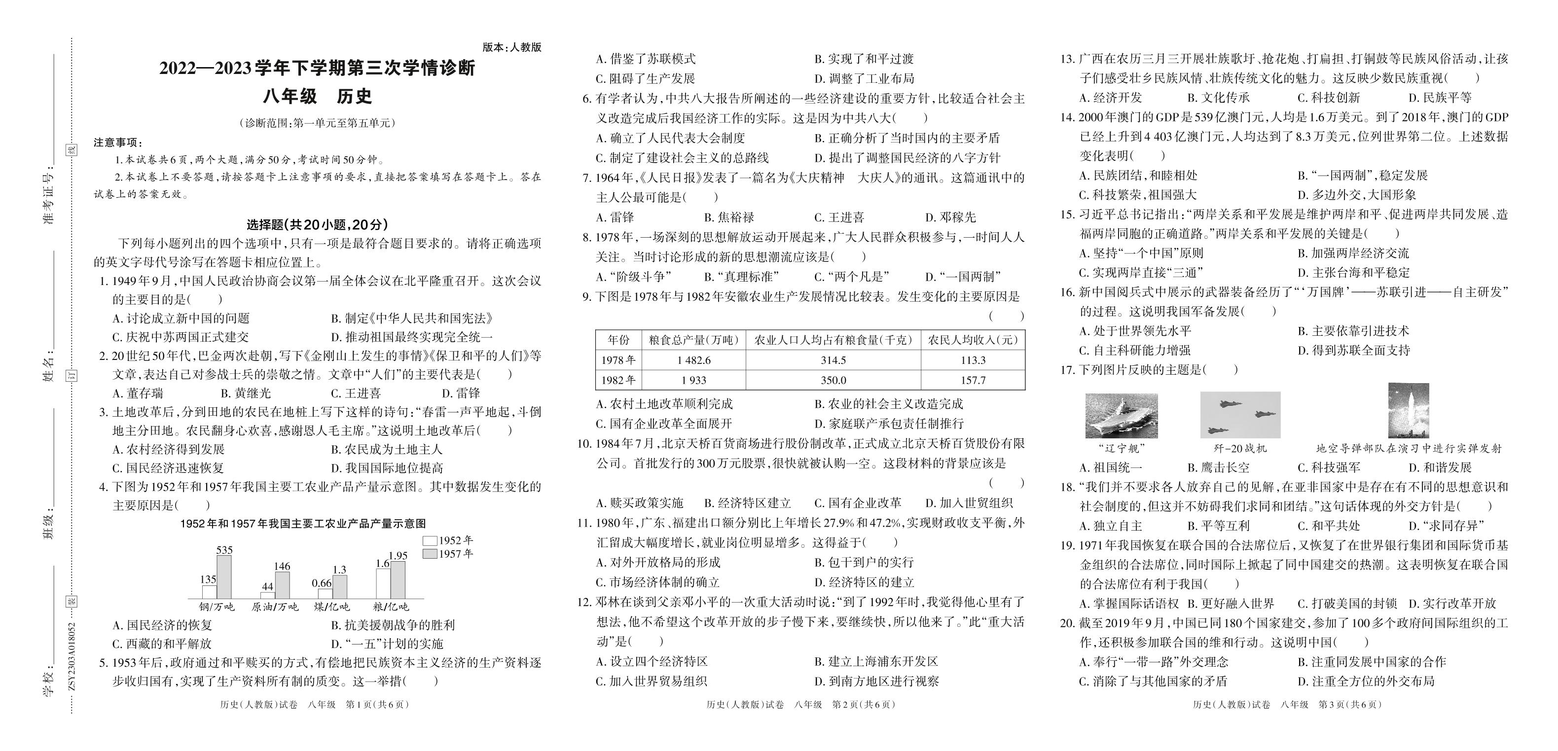 2022—2023学年下学期第三次学情诊断A卷八年级历史(人教版)