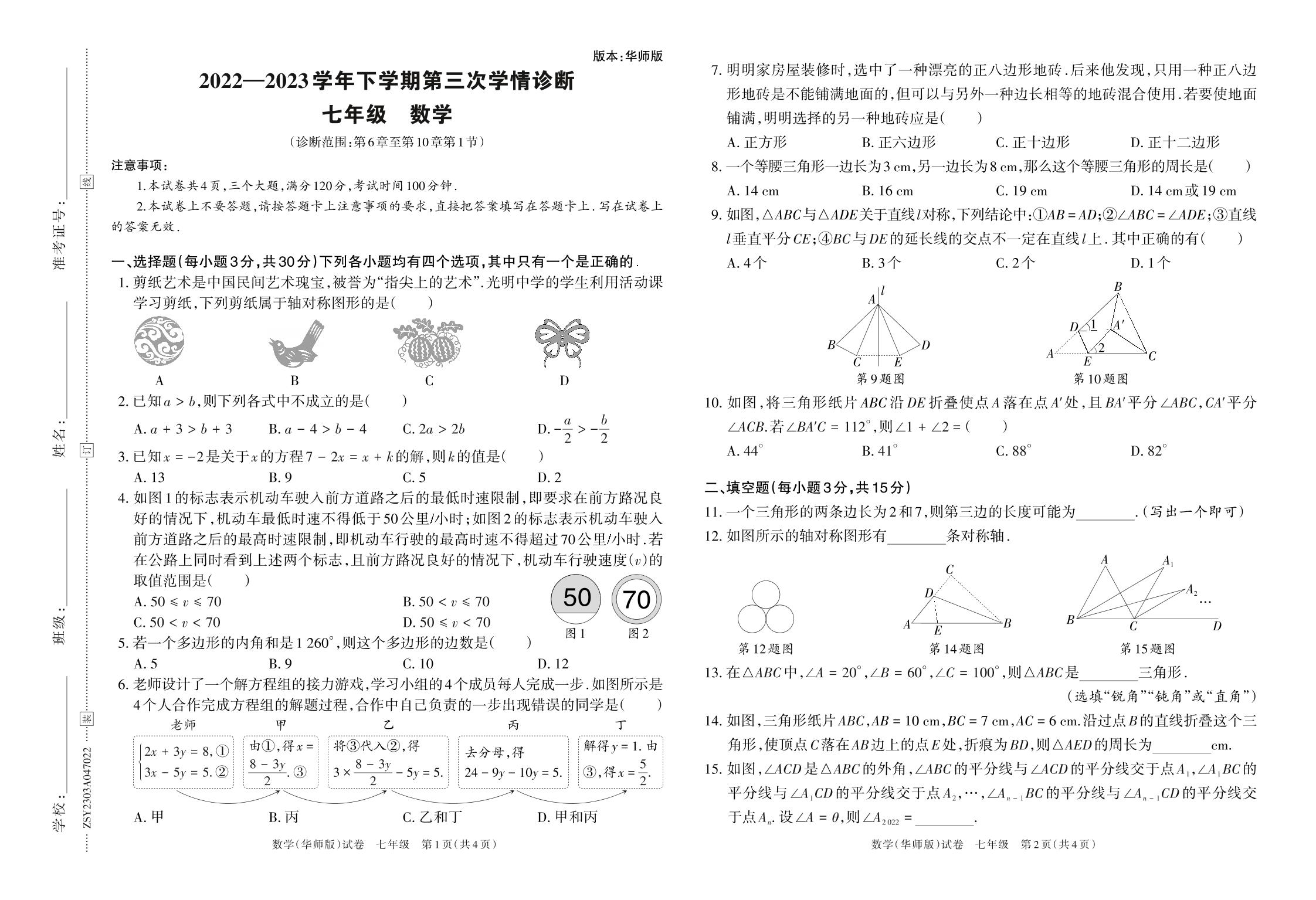 2022—2023学年下学期第三次学情诊断A卷七年级数学(华师版)