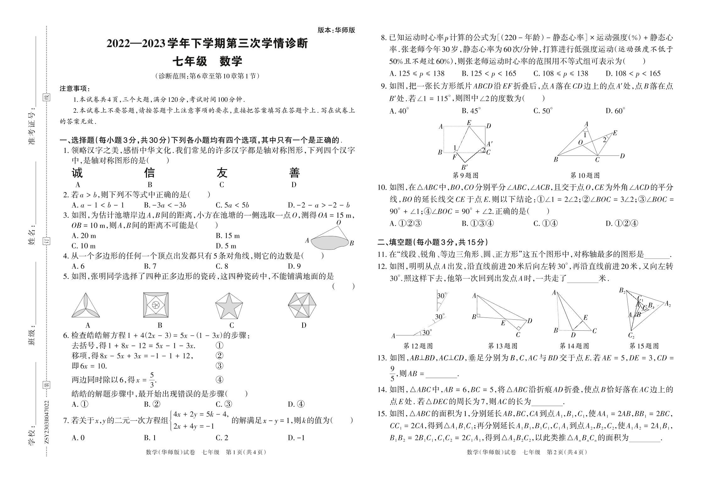 2022—2023学年下学期第三次学情诊断B卷七年级数学(华师版)