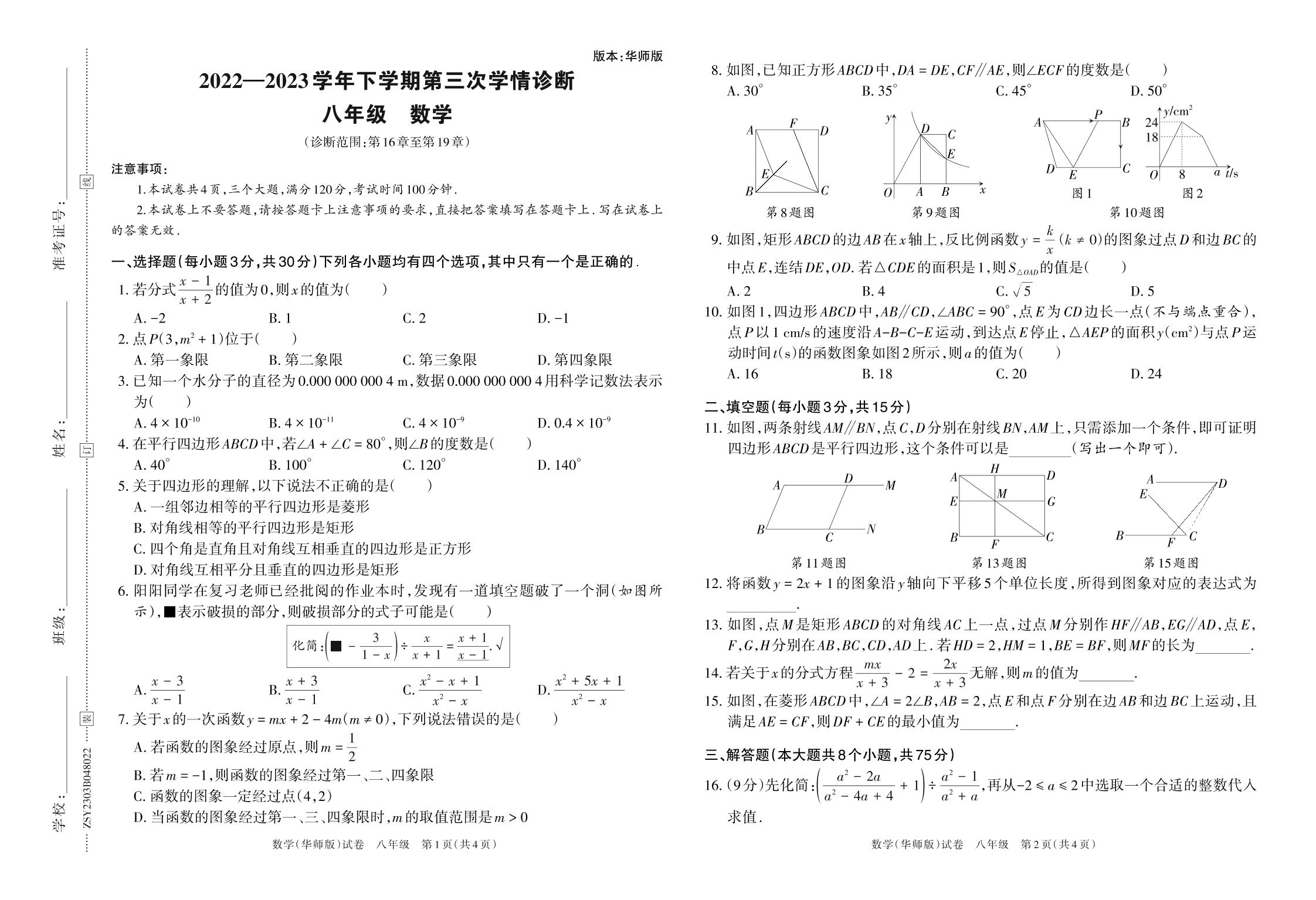 2022—2023学年下学期第三次学情诊断B卷八年级数学(华师版)
