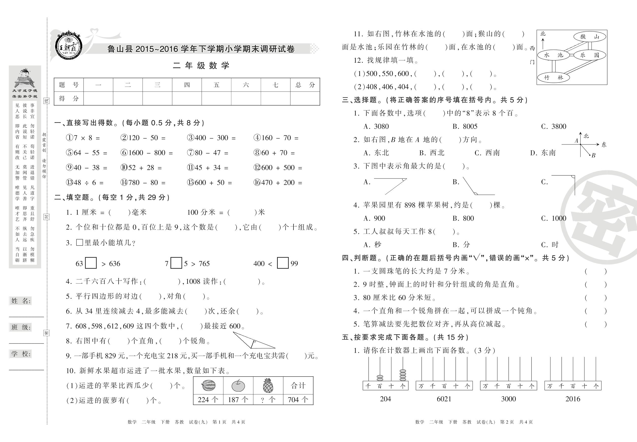 2015-2016学年第二学期平顶山市鲁山县二年级数学试卷(苏教版)【9】
