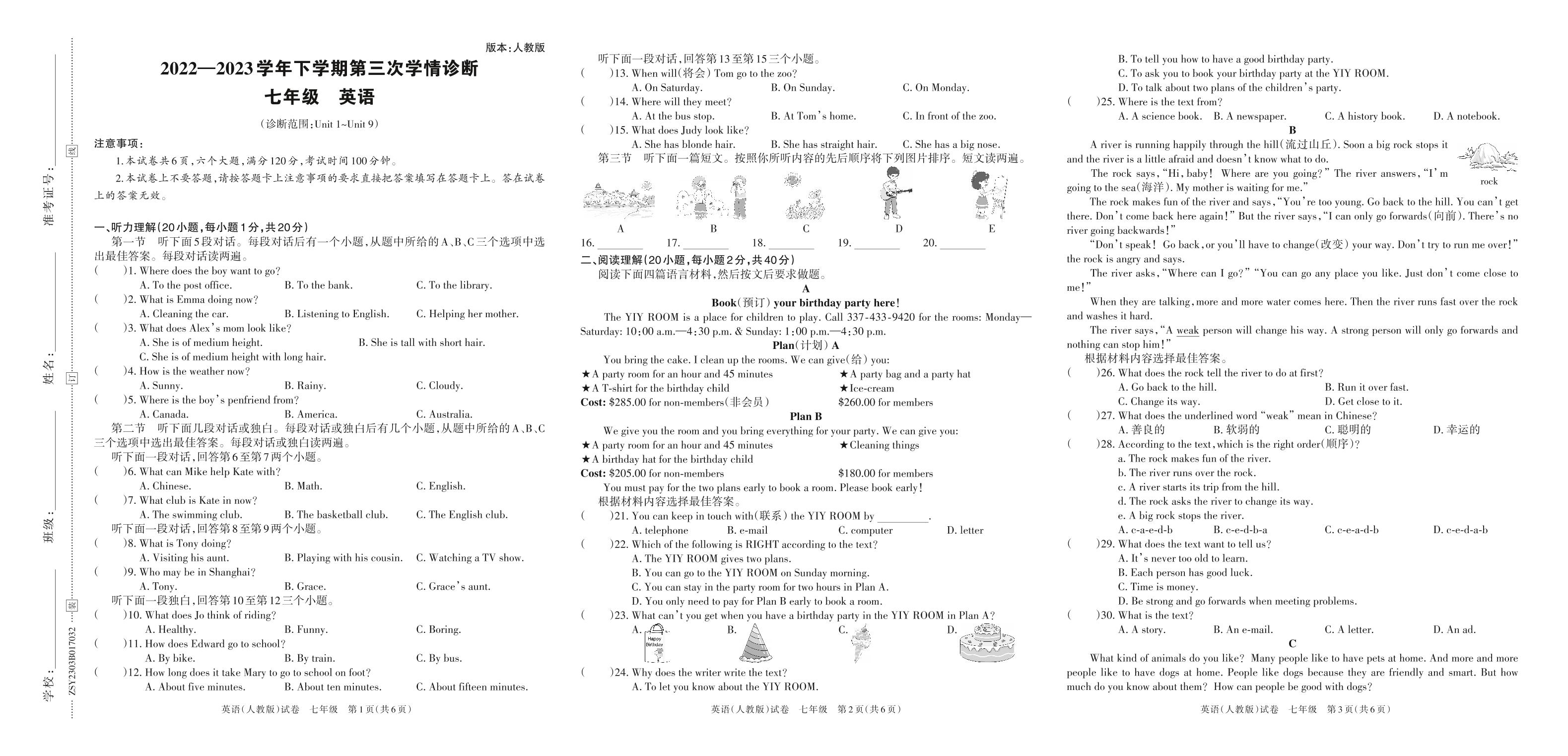 2022—2023学年下学期第三次学情诊断B卷七年级英语(人教版)