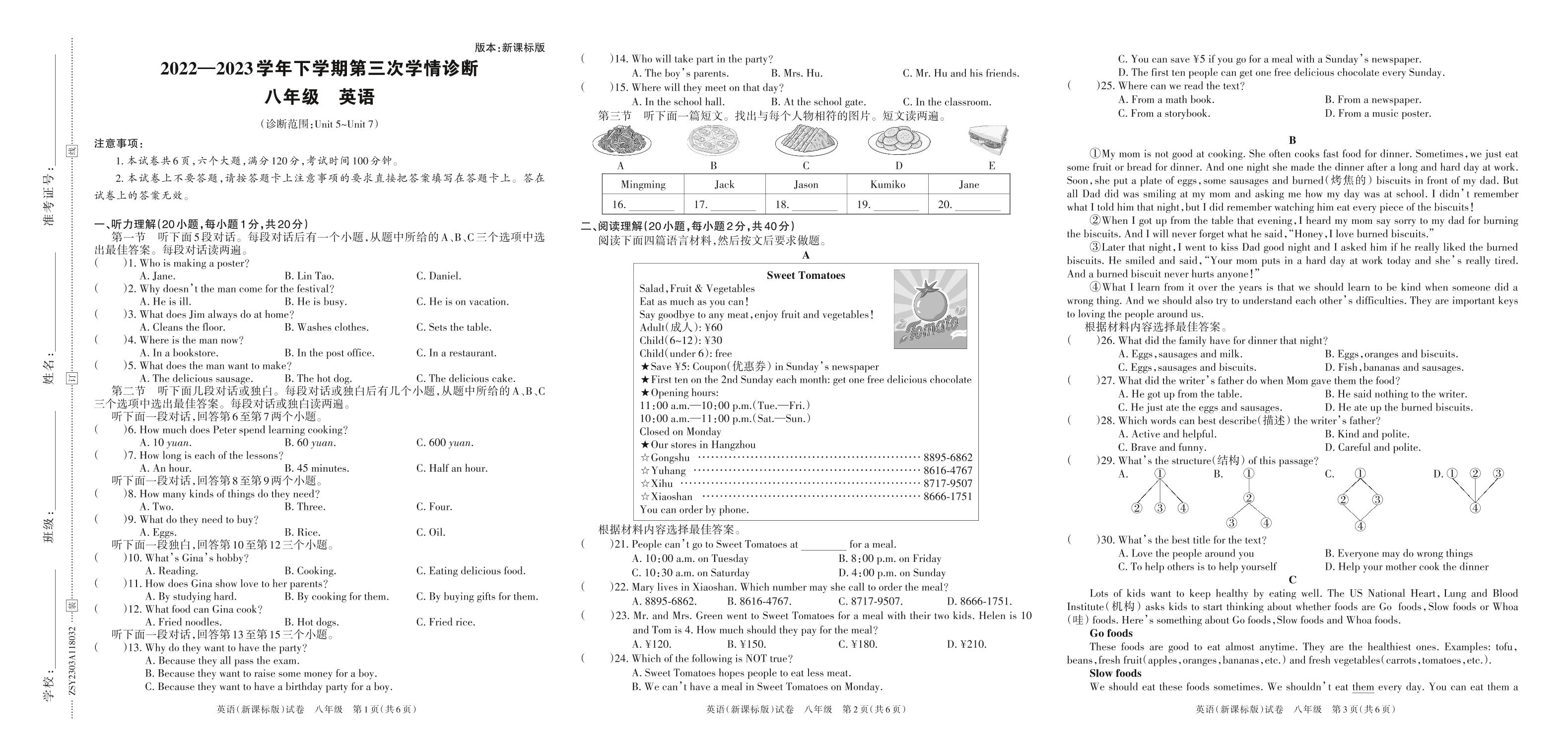 2022—2023学年下学期第三次学情诊断A卷八年级英语(新课标版)