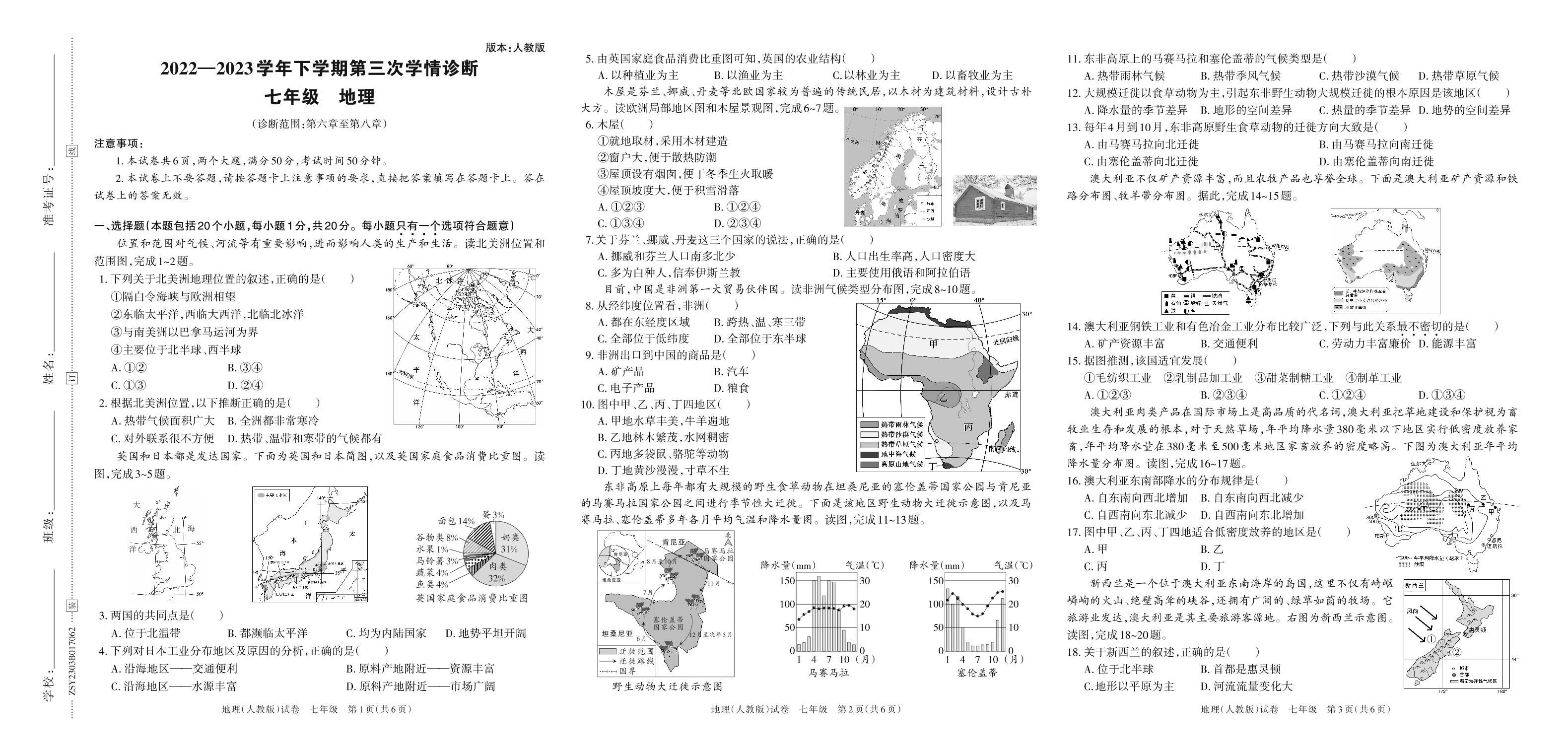 2022—2023学年下学期第三次学情诊断B卷七年级地理(人教版)
