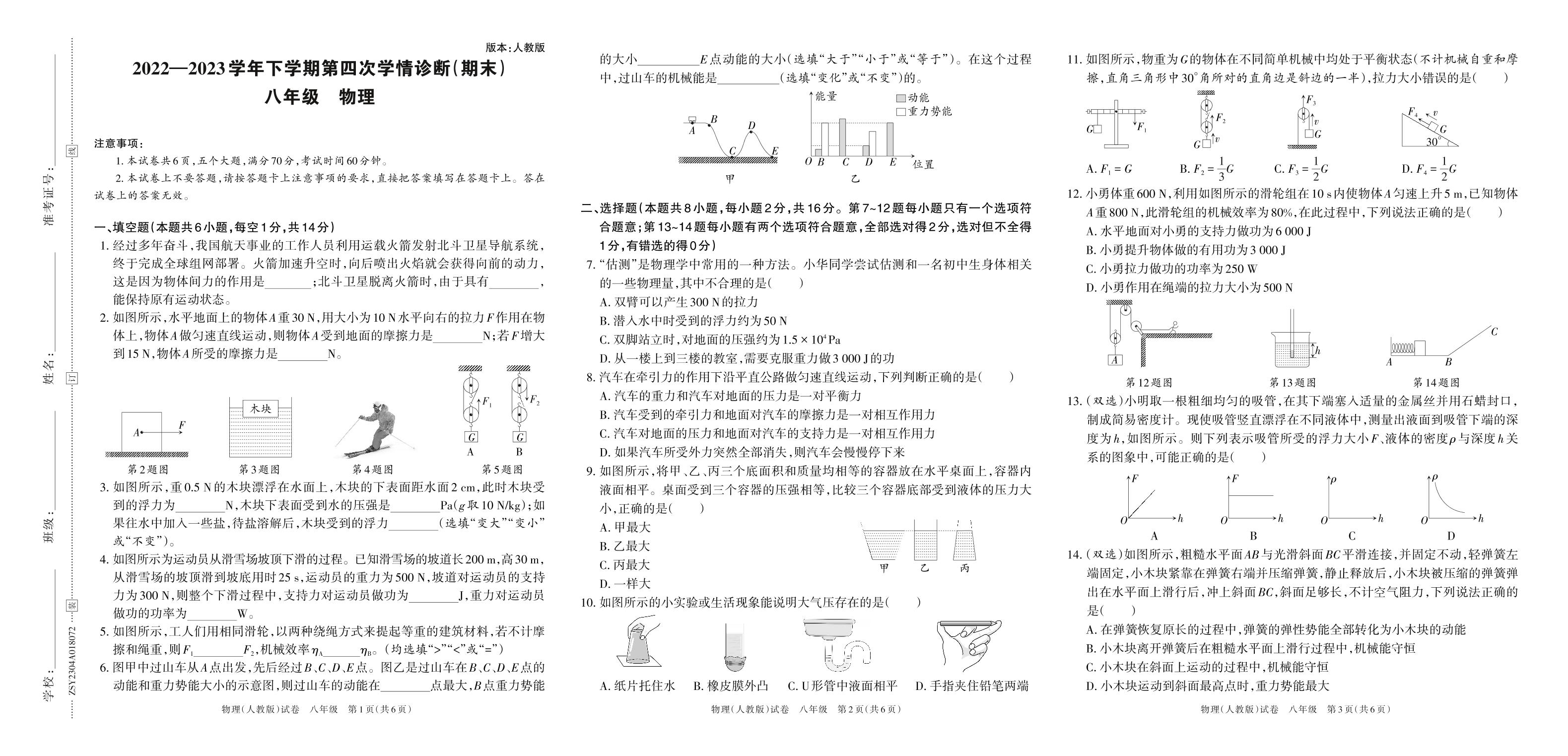 2022—2023学年下学期第四次学情诊断(期末)A卷八年级物理(人教版)