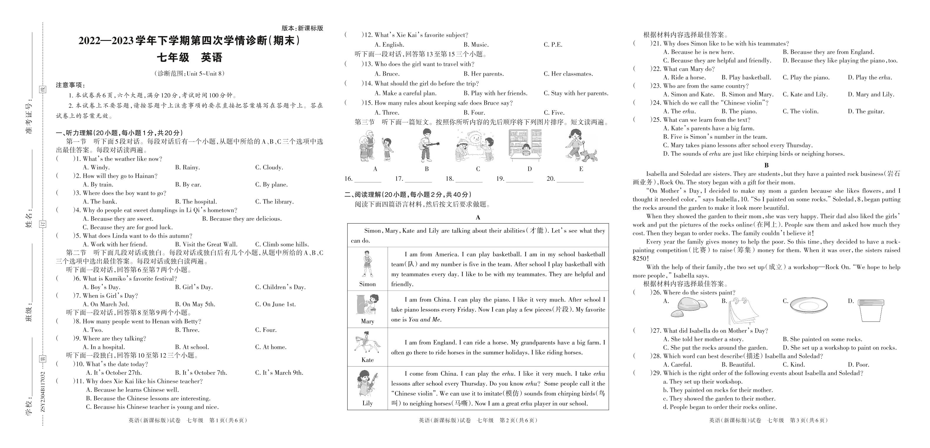 2022—2023学年下学期第四次学情诊断(期末)B卷七年级英语(新课标版)