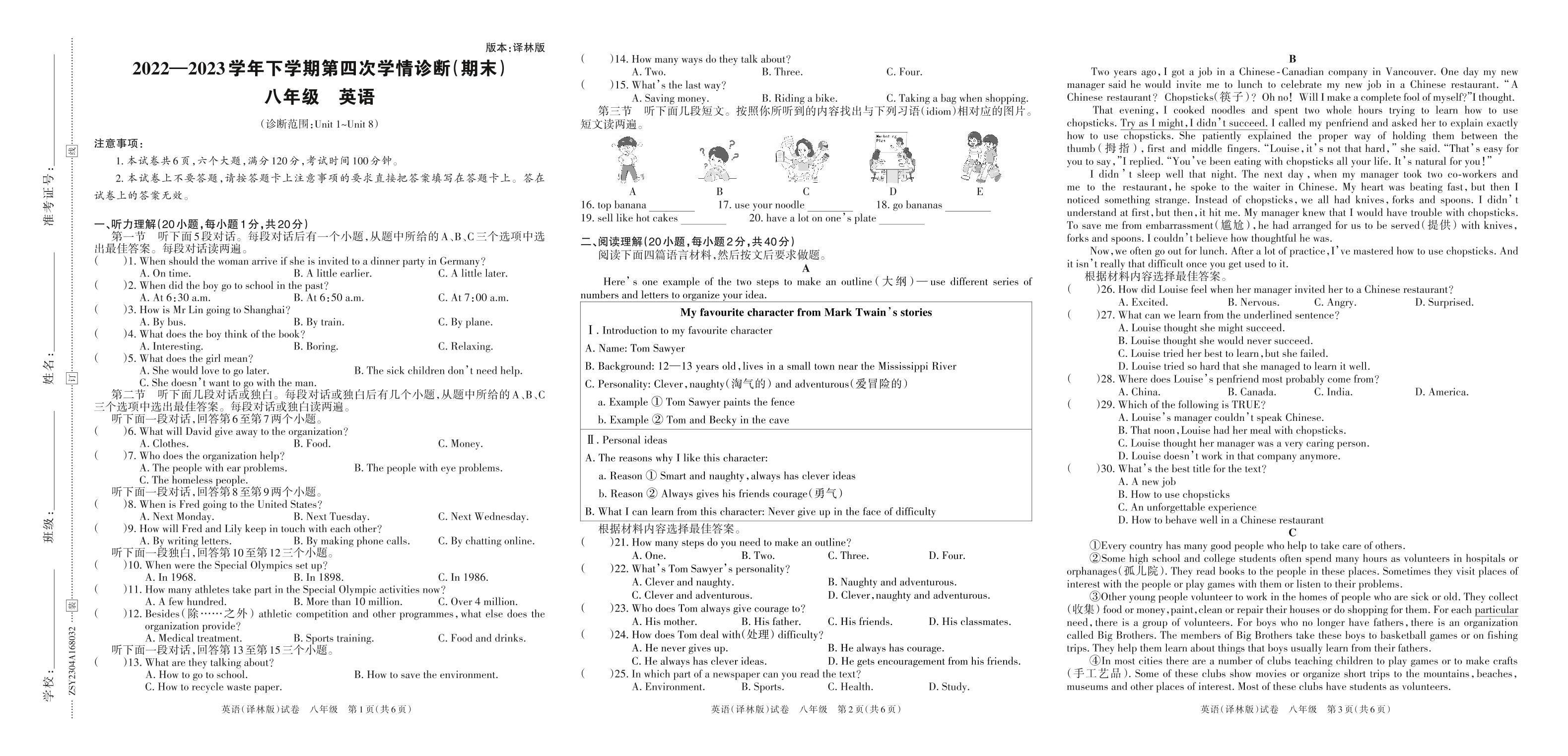 2022—2023学年下学期第四次学情诊断(期末)试卷八年级英语(译林版)