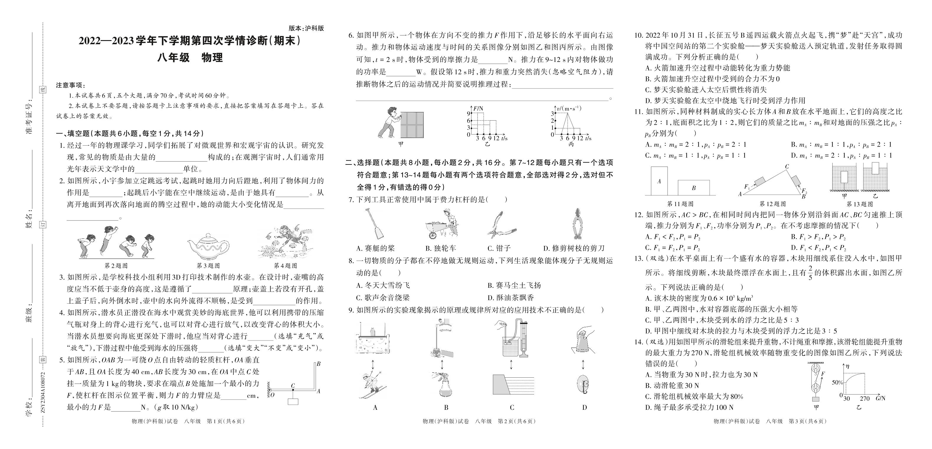 2022—2023学年下学期第四次学情诊断(期末)A卷八年级物理(沪科版)