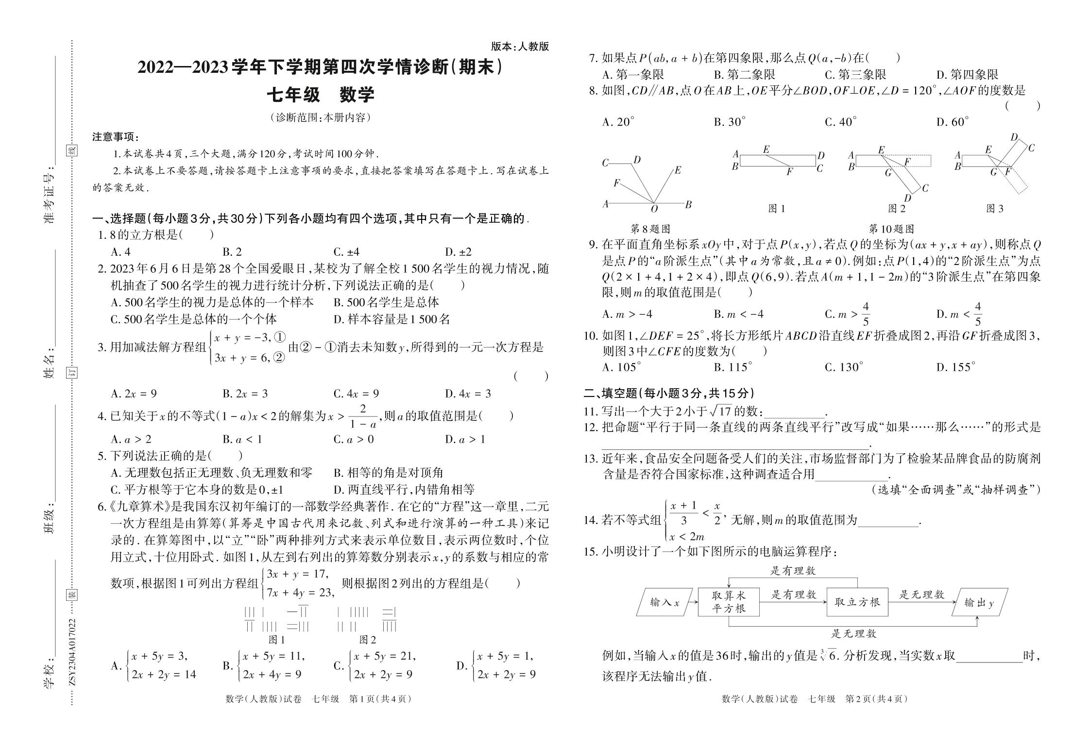 2022—2023学年下学期第四次学情诊断(期末)A卷七年级数学(人教版)