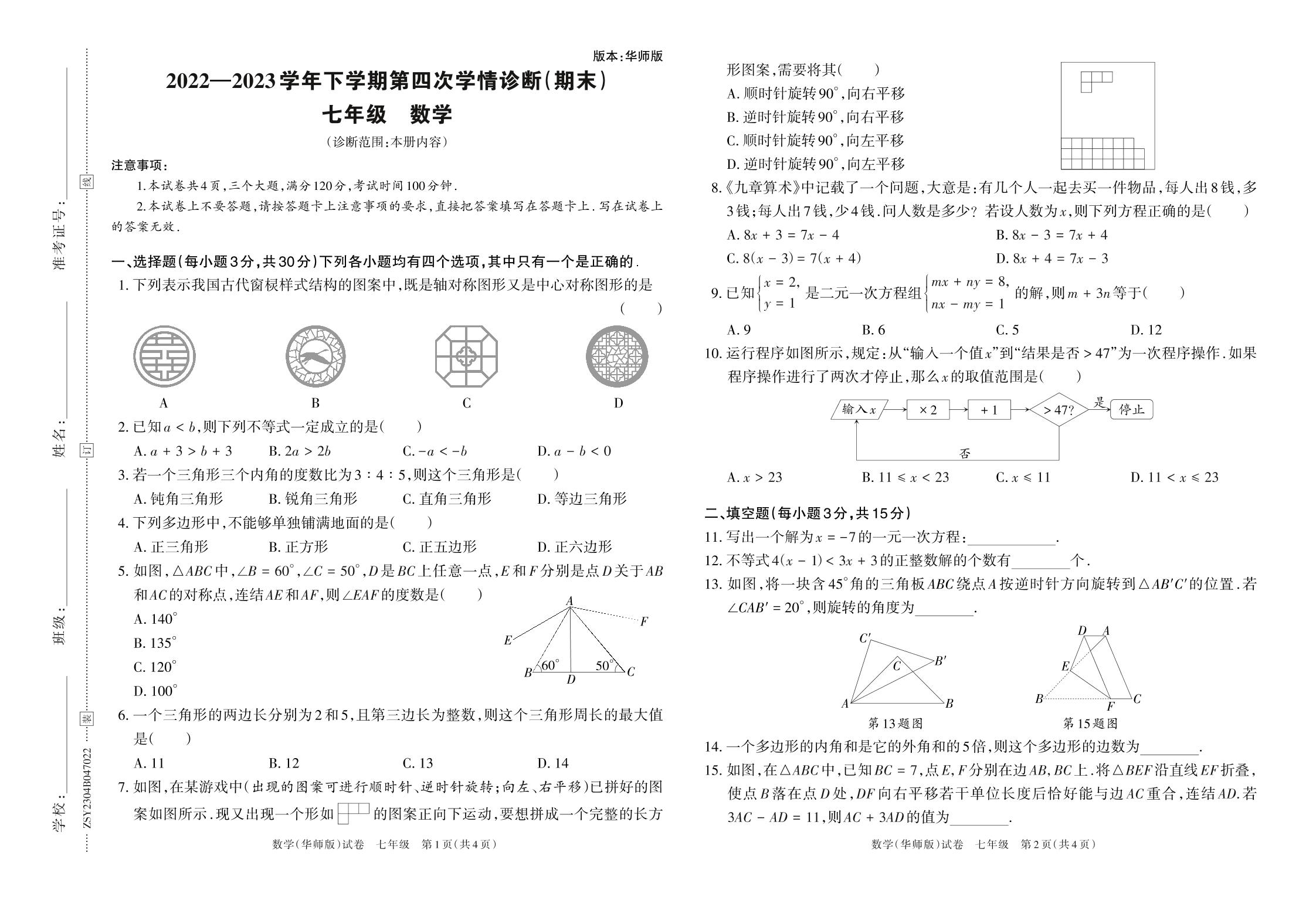 2022—2023学年下学期第四次学情诊断(期末)B卷七年级数学(华师版)
