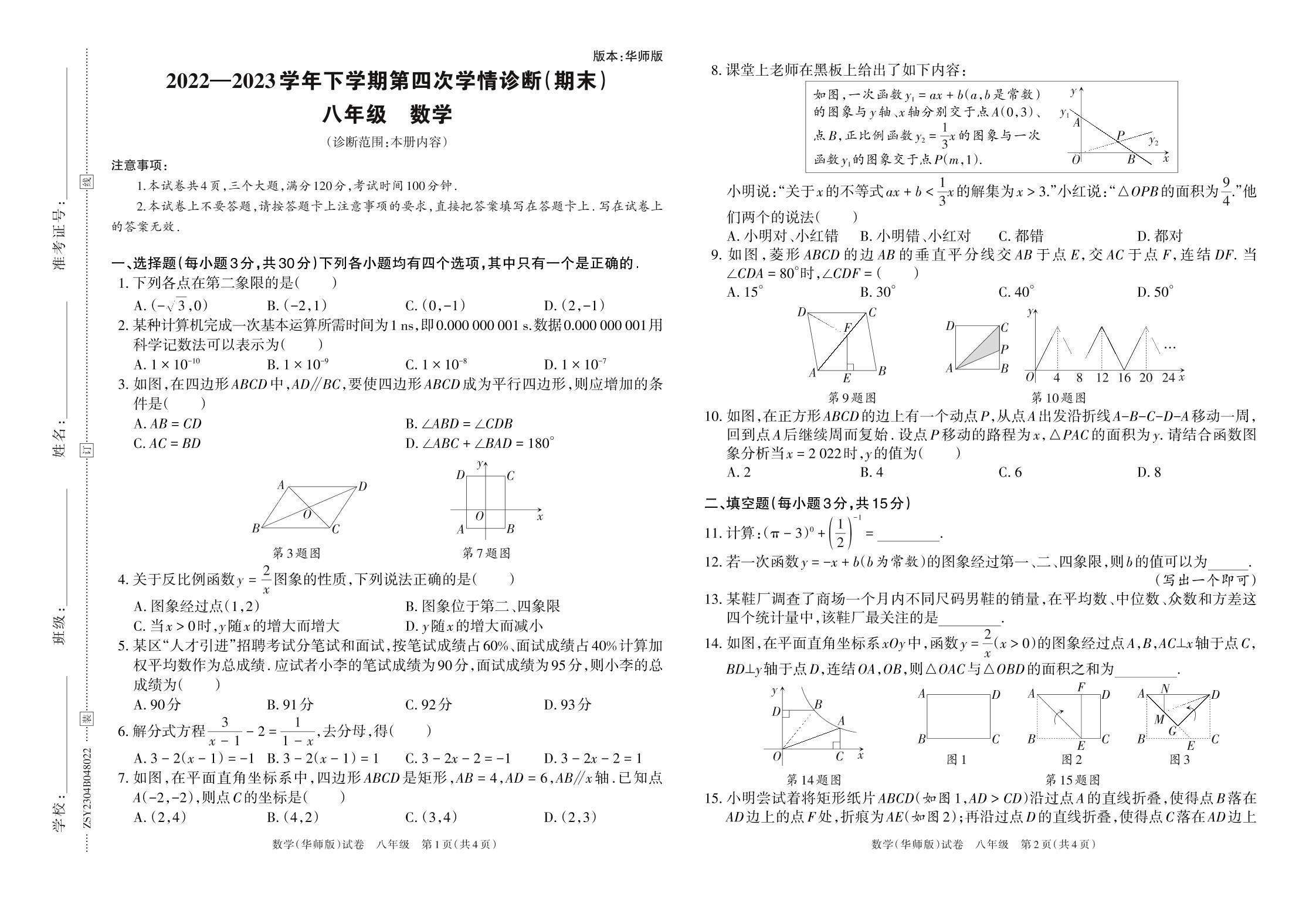 2022—2023学年下学期第四次学情诊断(期末)B卷八年级数学(华师版)