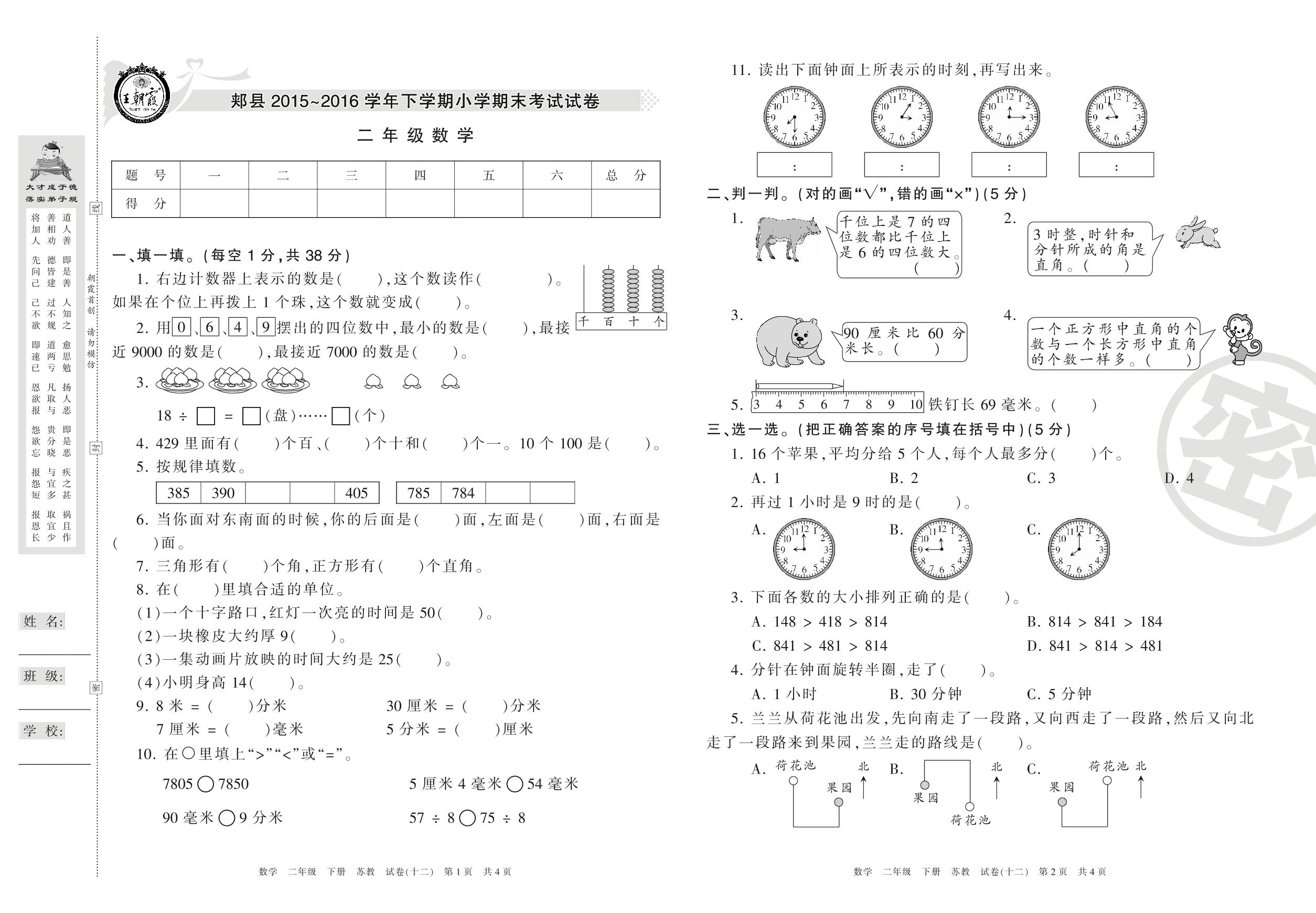 2015-2016学年第二学期平顶山市郏县二年级数学试卷(苏教版)【12】
