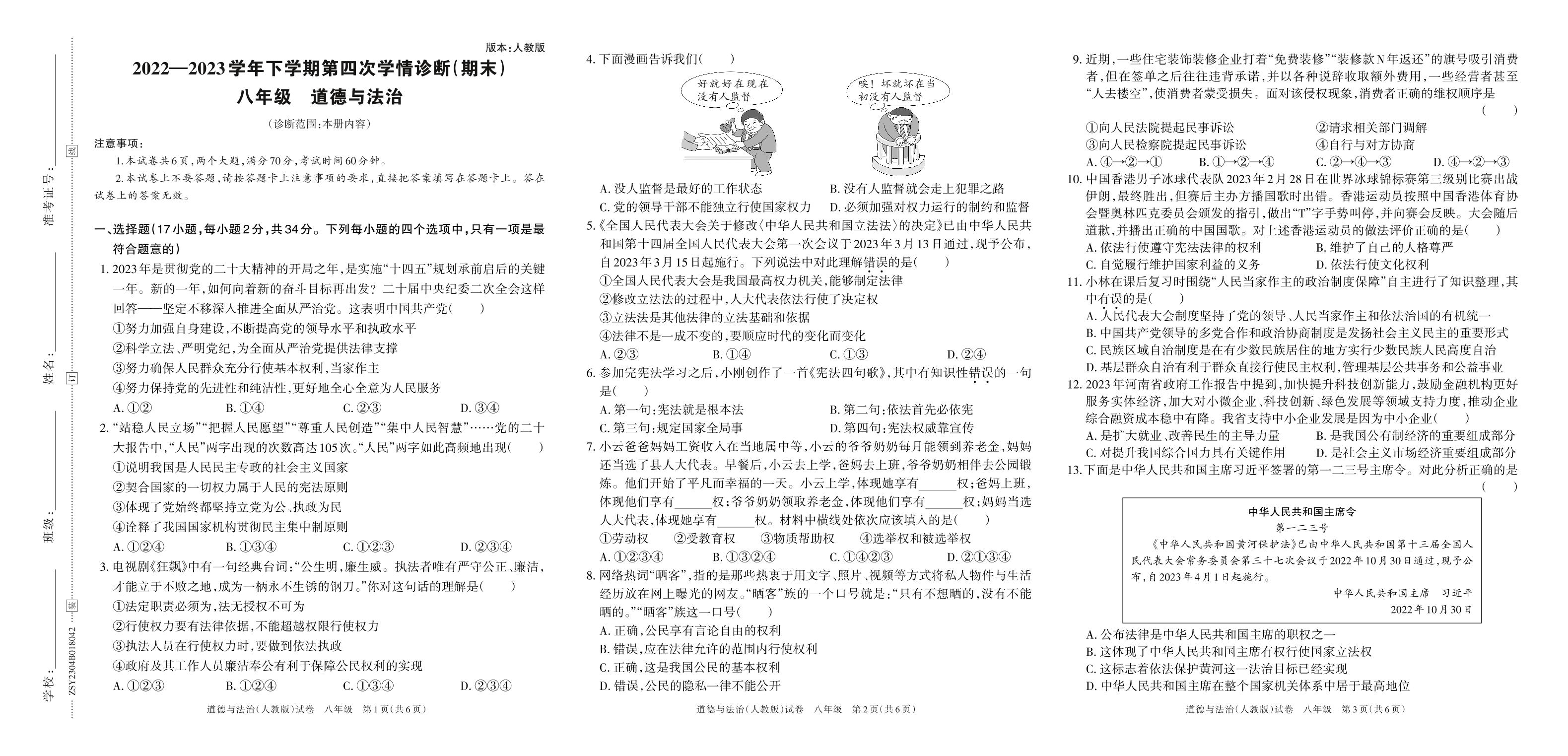 2022—2023学年下学期第四次学情诊断(期末)B卷八年级道德与法治(人教版)