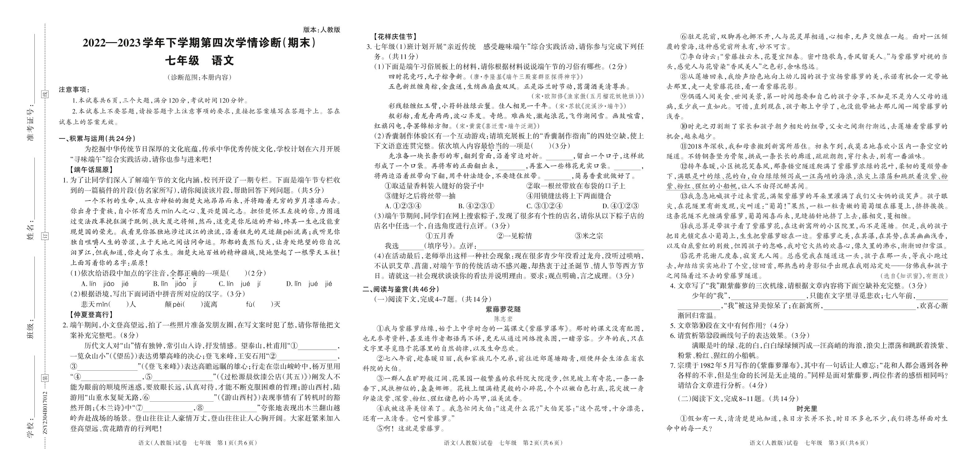 2022—2023学年下学期第四次学情诊断(期末)B卷七年级语文(人教版)