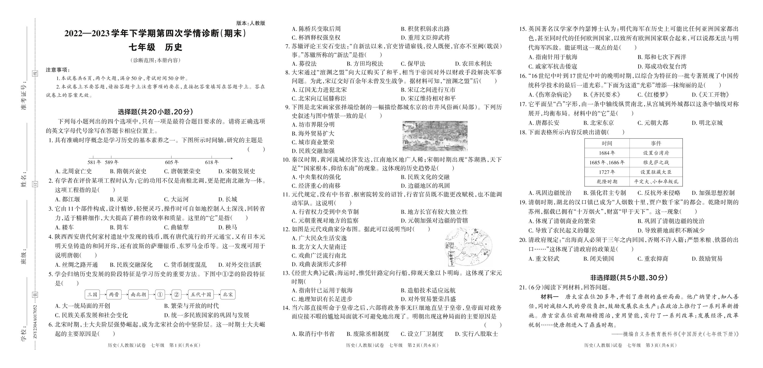 2022—2023学年下学期第四次学情诊断(期末)A卷七年级历史(人教版)
