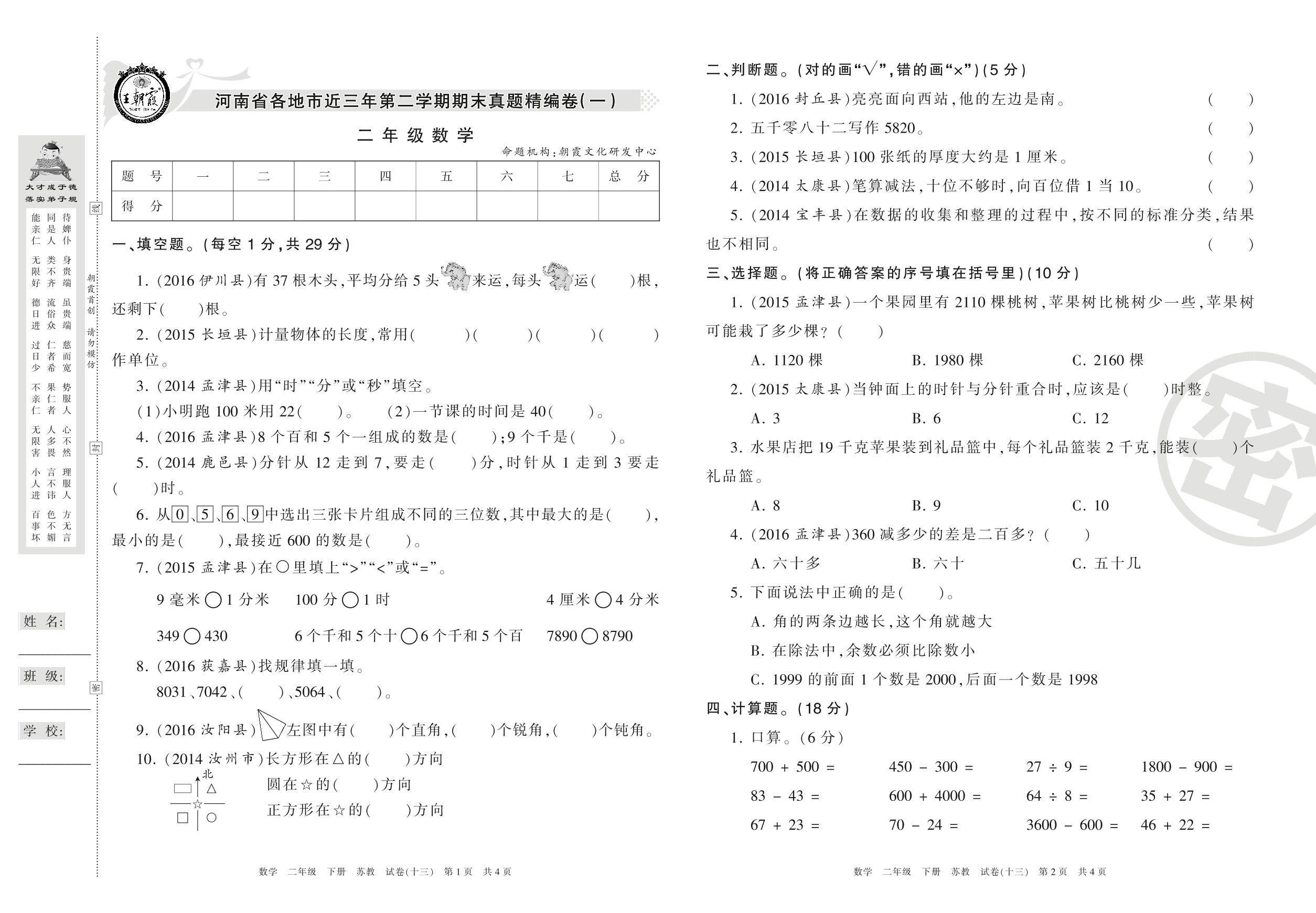 河南省近三年精编(一)二年级下册数学(苏教版)【13】