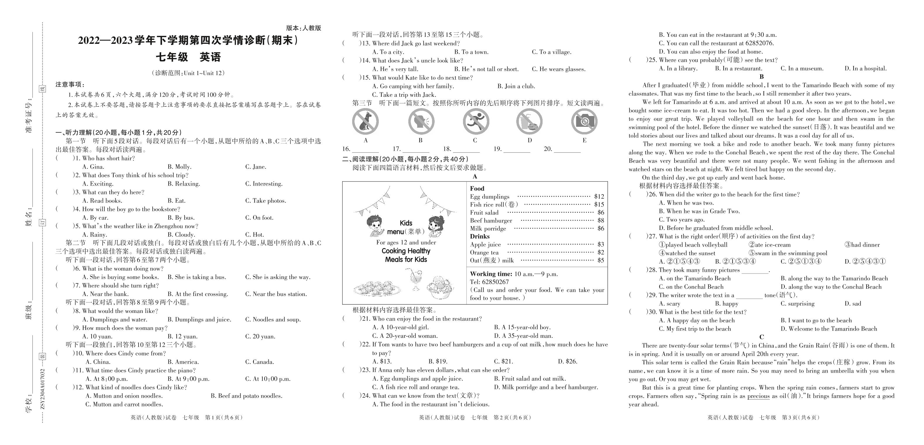 2022—2023学年下学期第四次学情诊断(期末)A卷七年级英语(人教版)