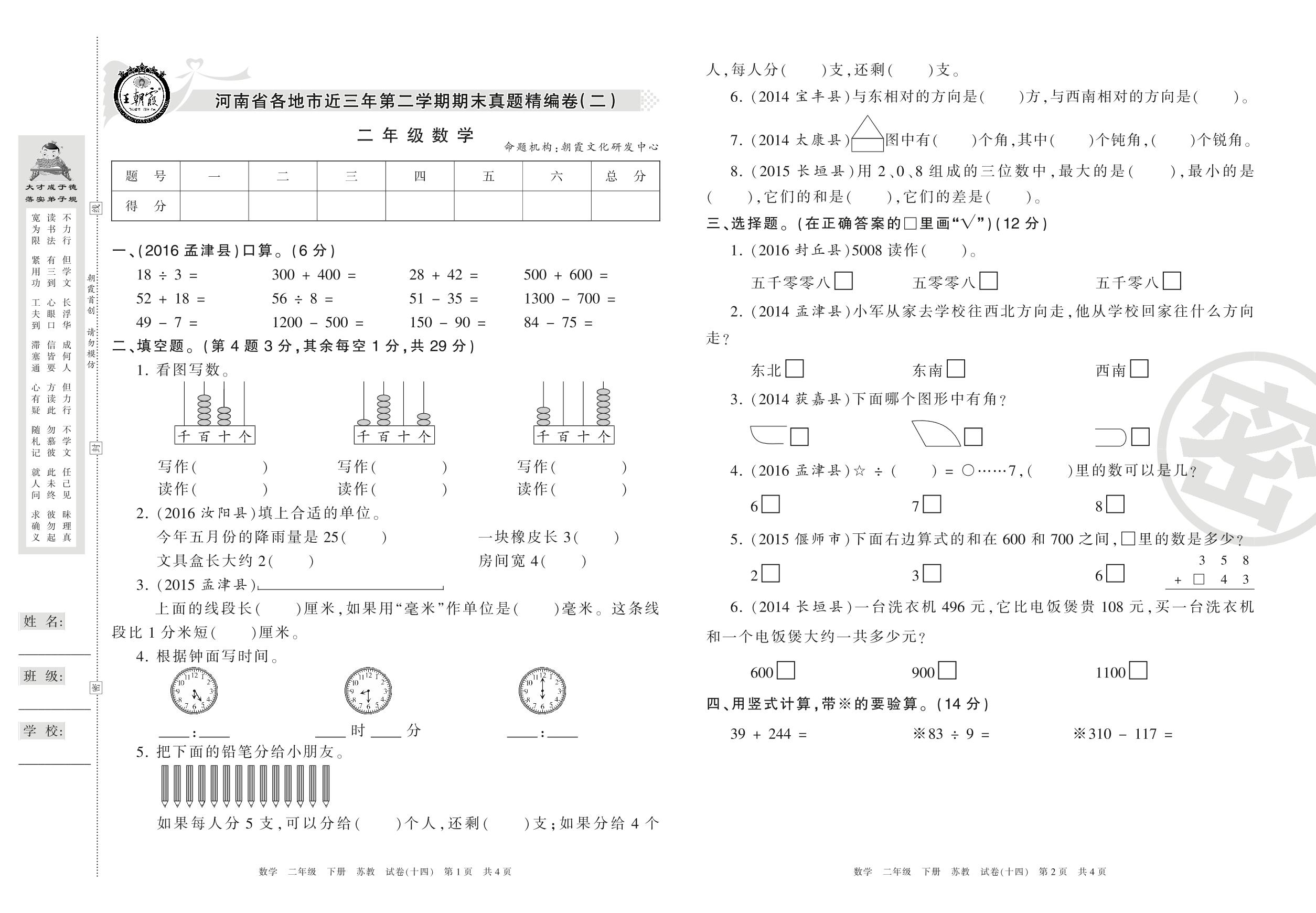 河南省近三年精编(二)二年级下册数学(苏教版)【14】