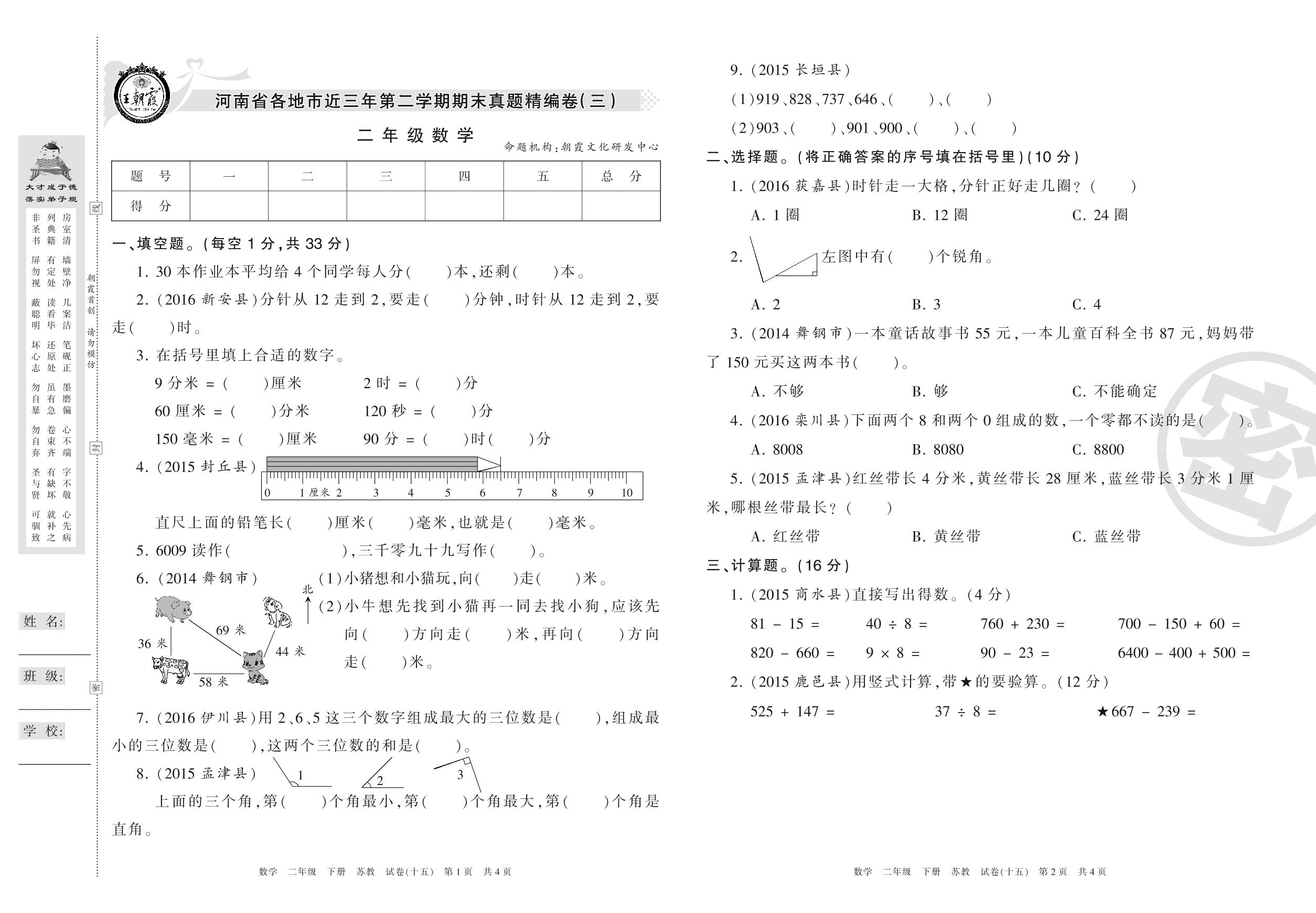 河南省近三年精编(三)二年级下册数学(苏教版)【15】