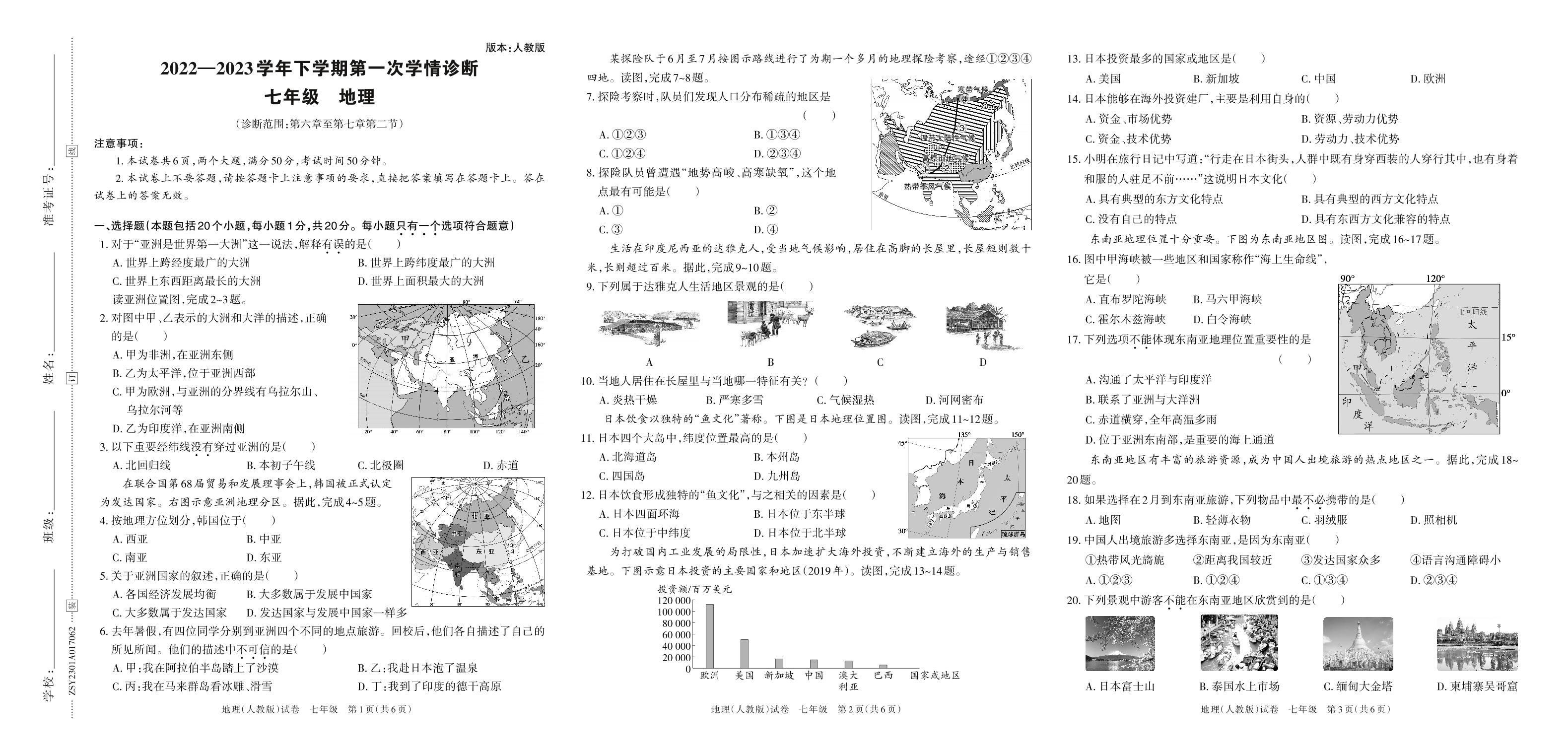 七年级地理人教版下册月考卷