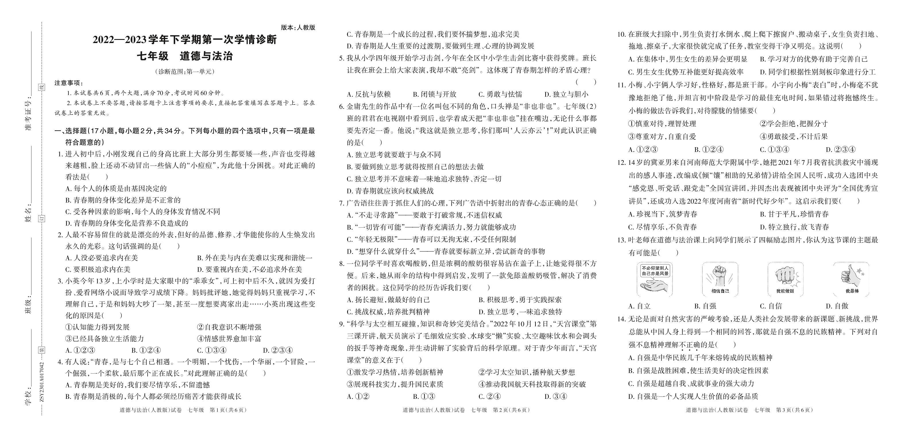 2022—2023学年下学期第一次学情诊断A卷七年级道德与法治(人教版)