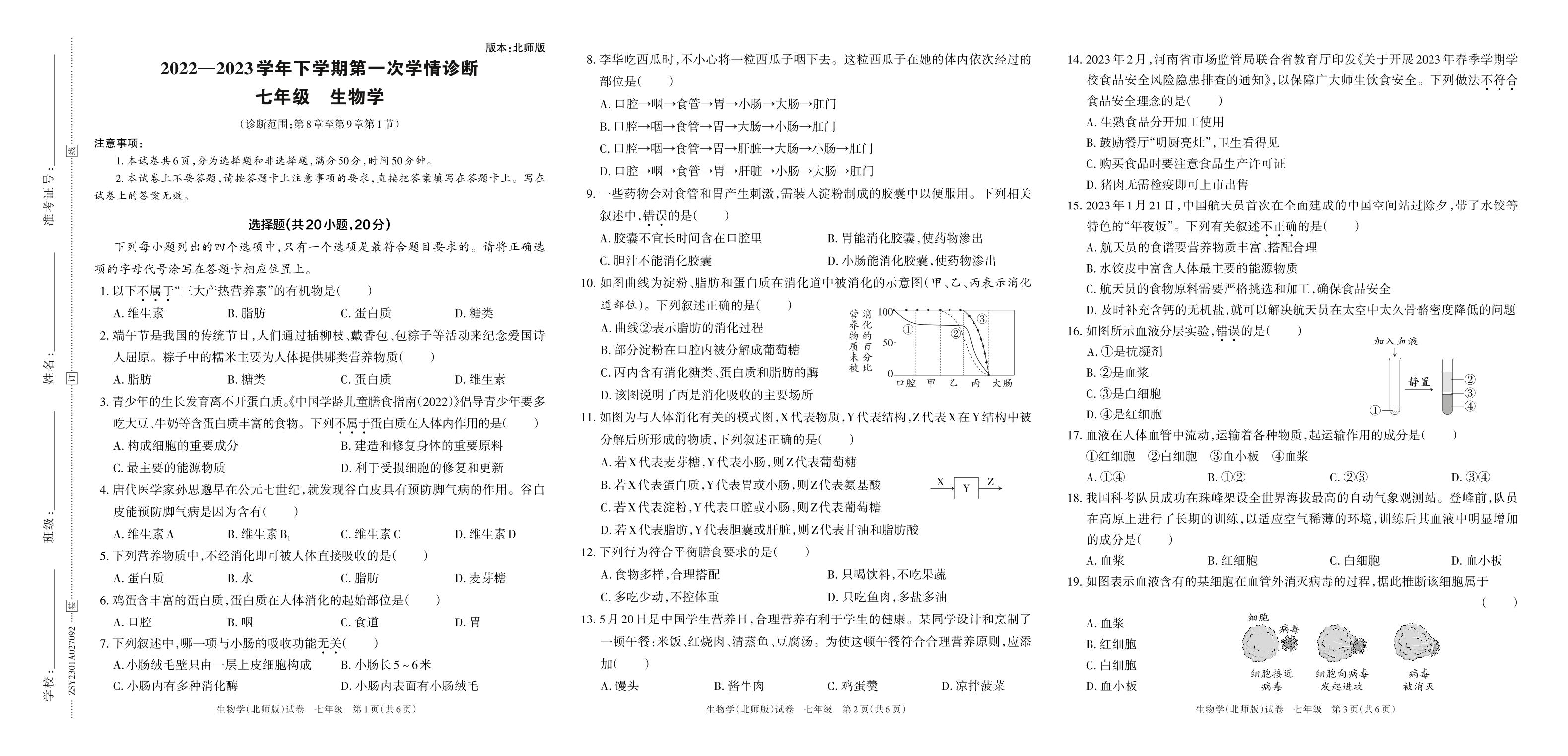 2022—2023学年下学期第一次学情诊断试卷七年级生物(北师版)