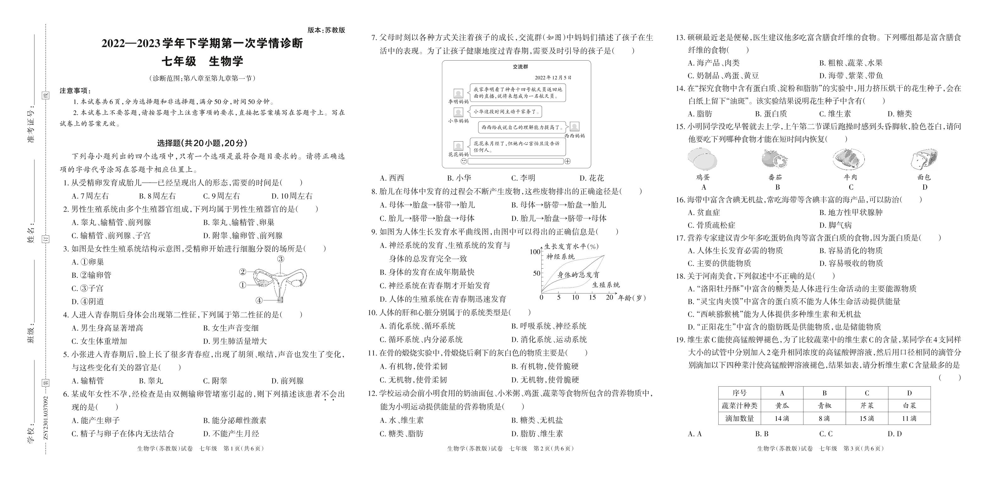 2022—2023学年下学期第一次学情诊断A卷七年级生物(苏教版)