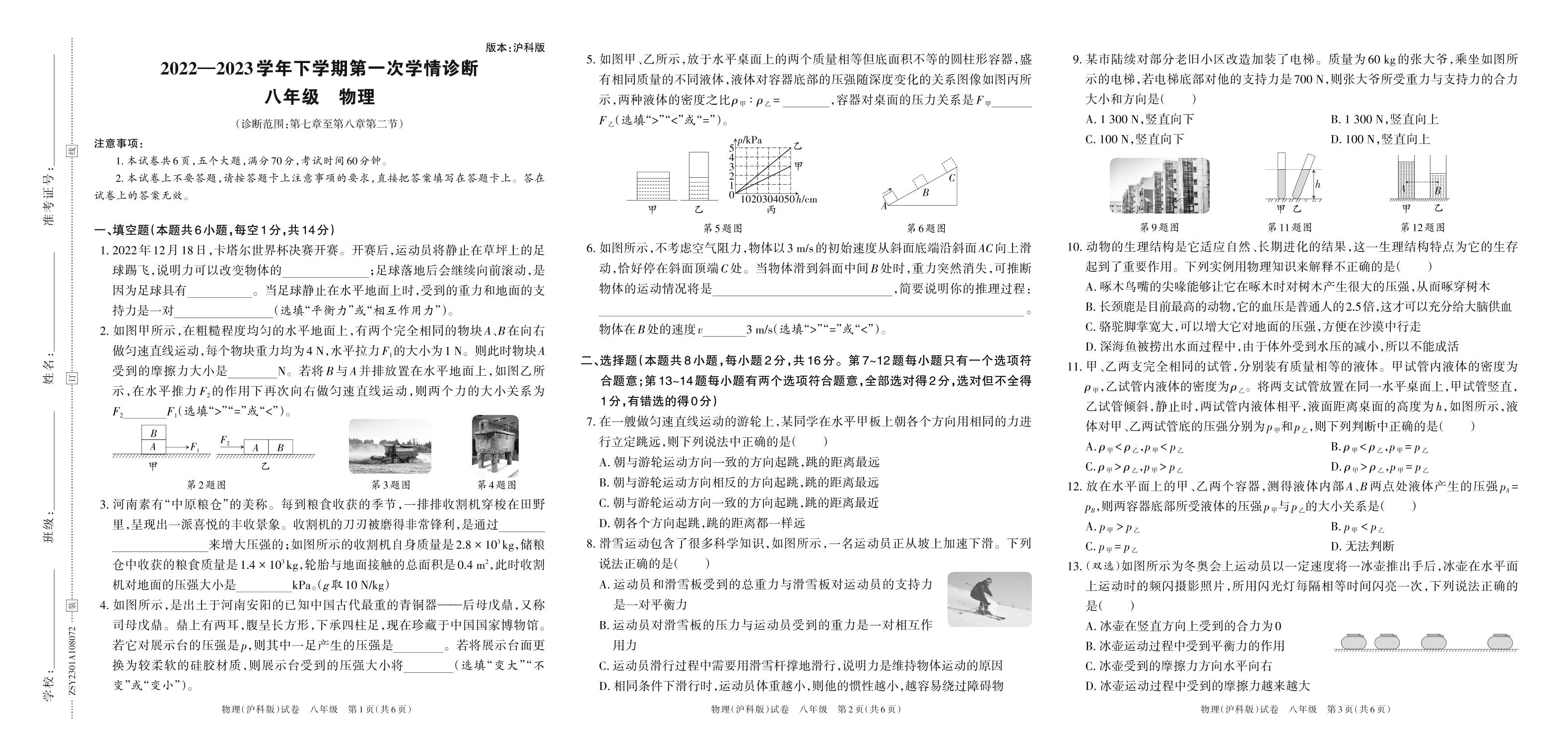 八年级物理沪科版下册月考卷