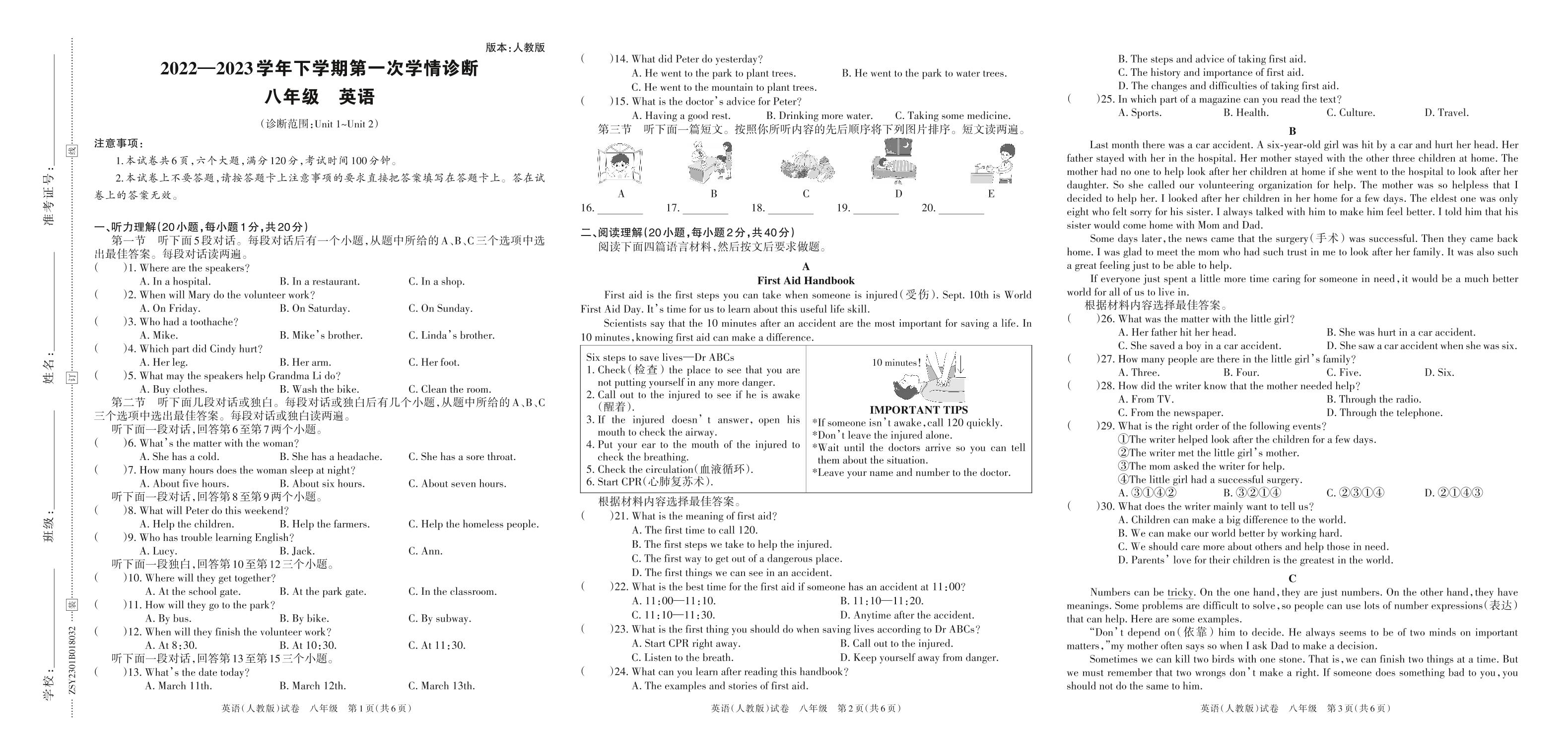 2022—2023学年下学期第一次学情诊断B卷八年级英语(人教版)