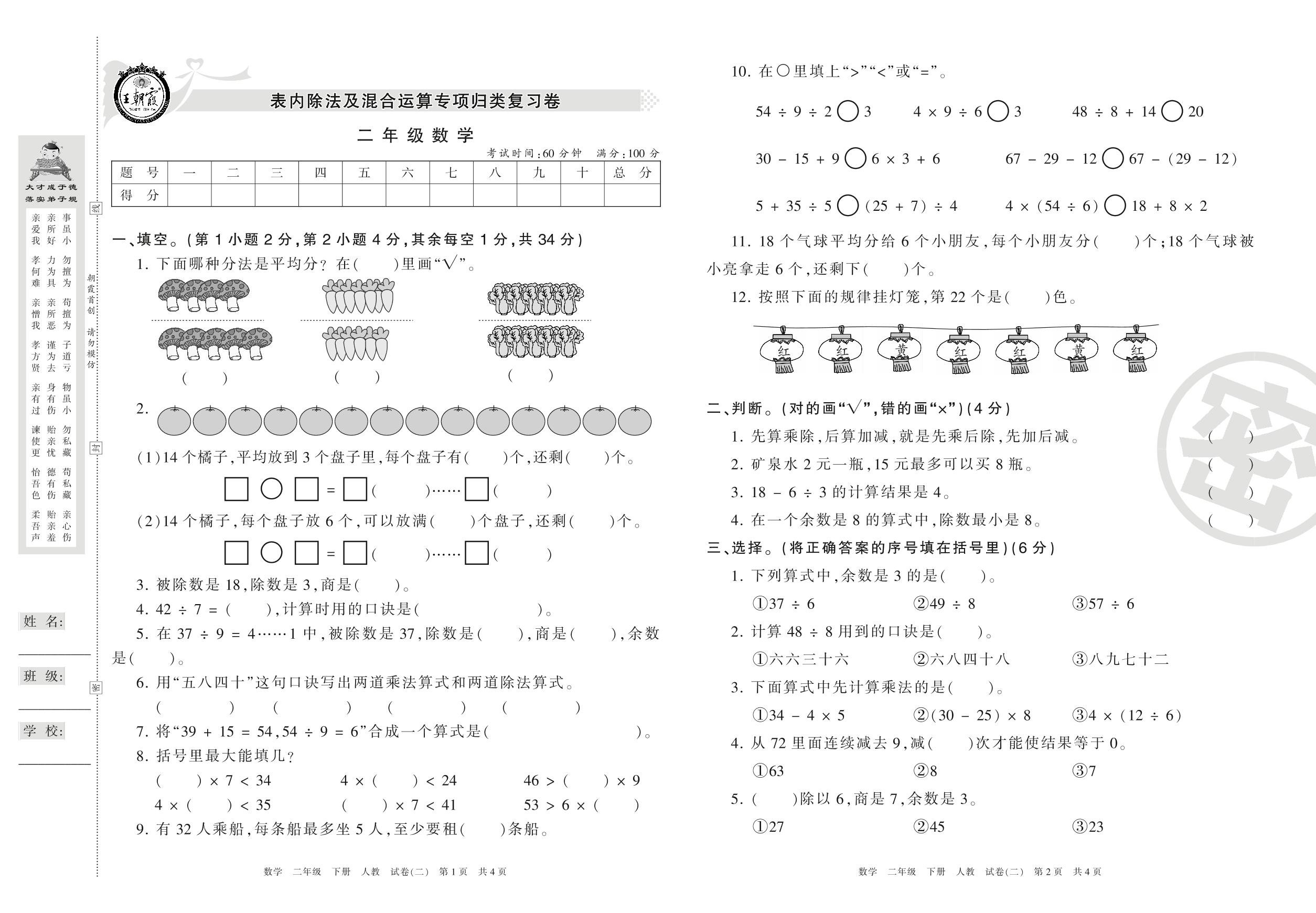 二年级数学人教版下册专项卷