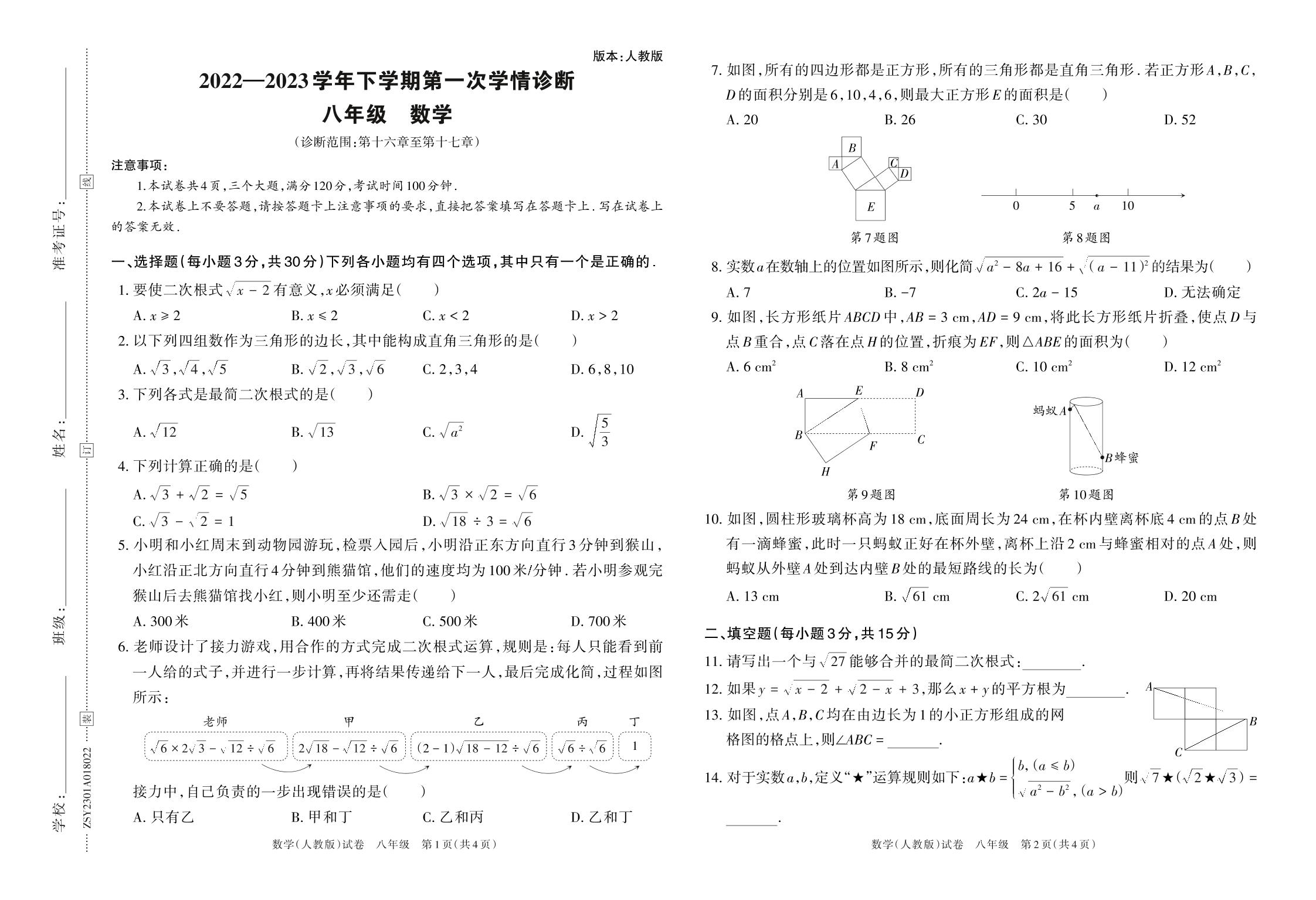 2022—2023学年下学期第一次学情诊断A卷八年级数学(人教版)