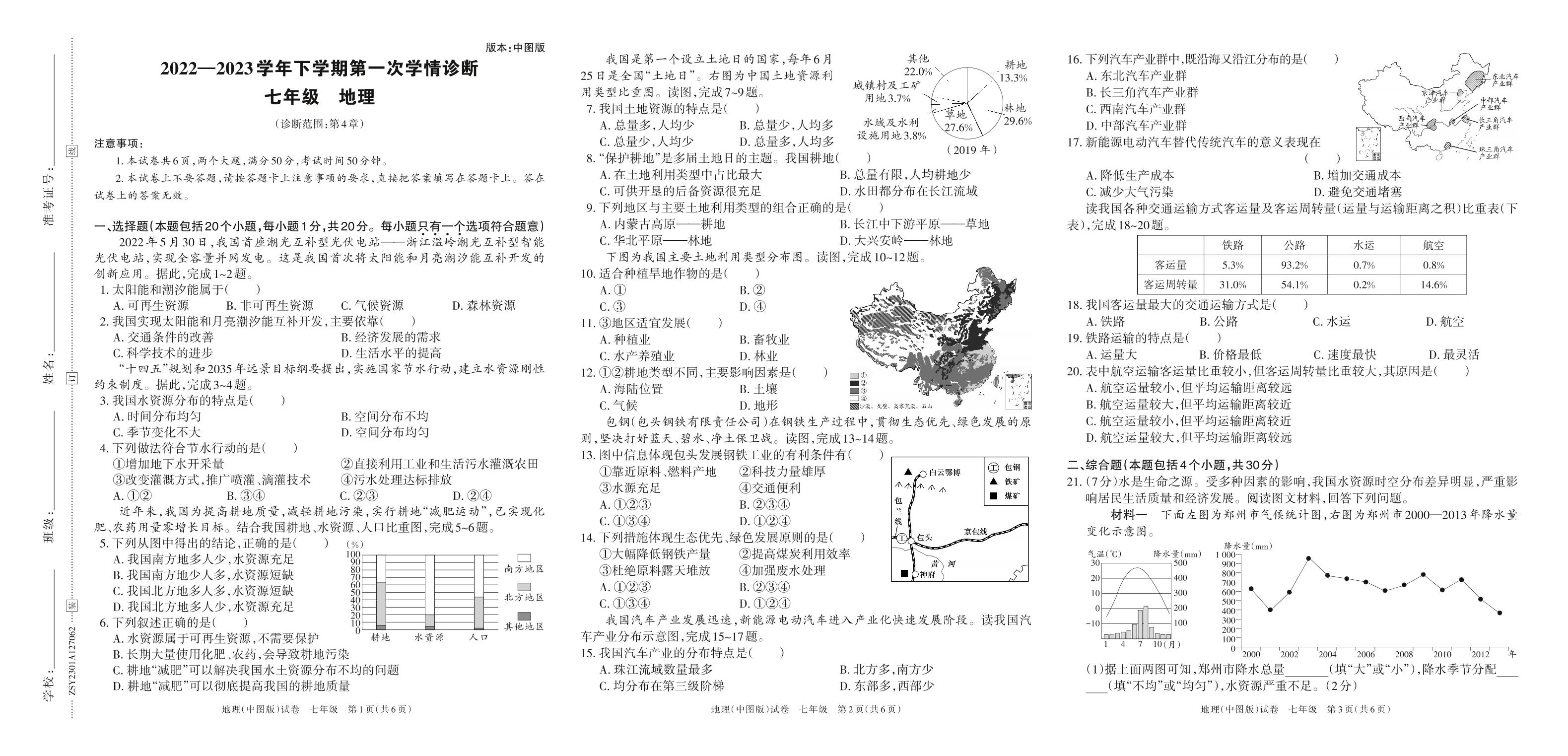 2022—2023学年下学期第一次学情诊断试卷七年级地理(中图版)