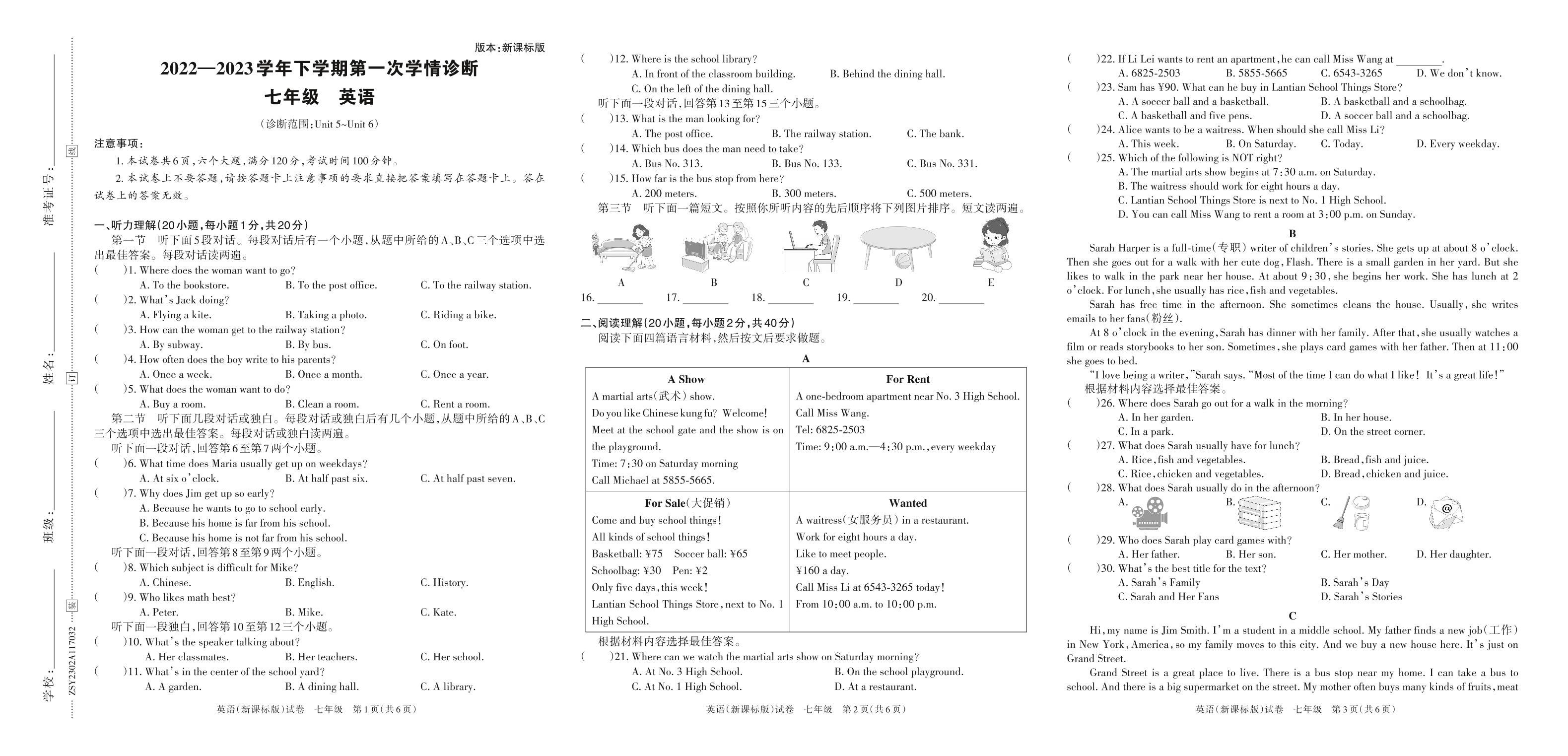 河南省洛阳市孟津区县直中学2022—2023学年下学期第一次学情诊断试卷七年级英语(新课标版)