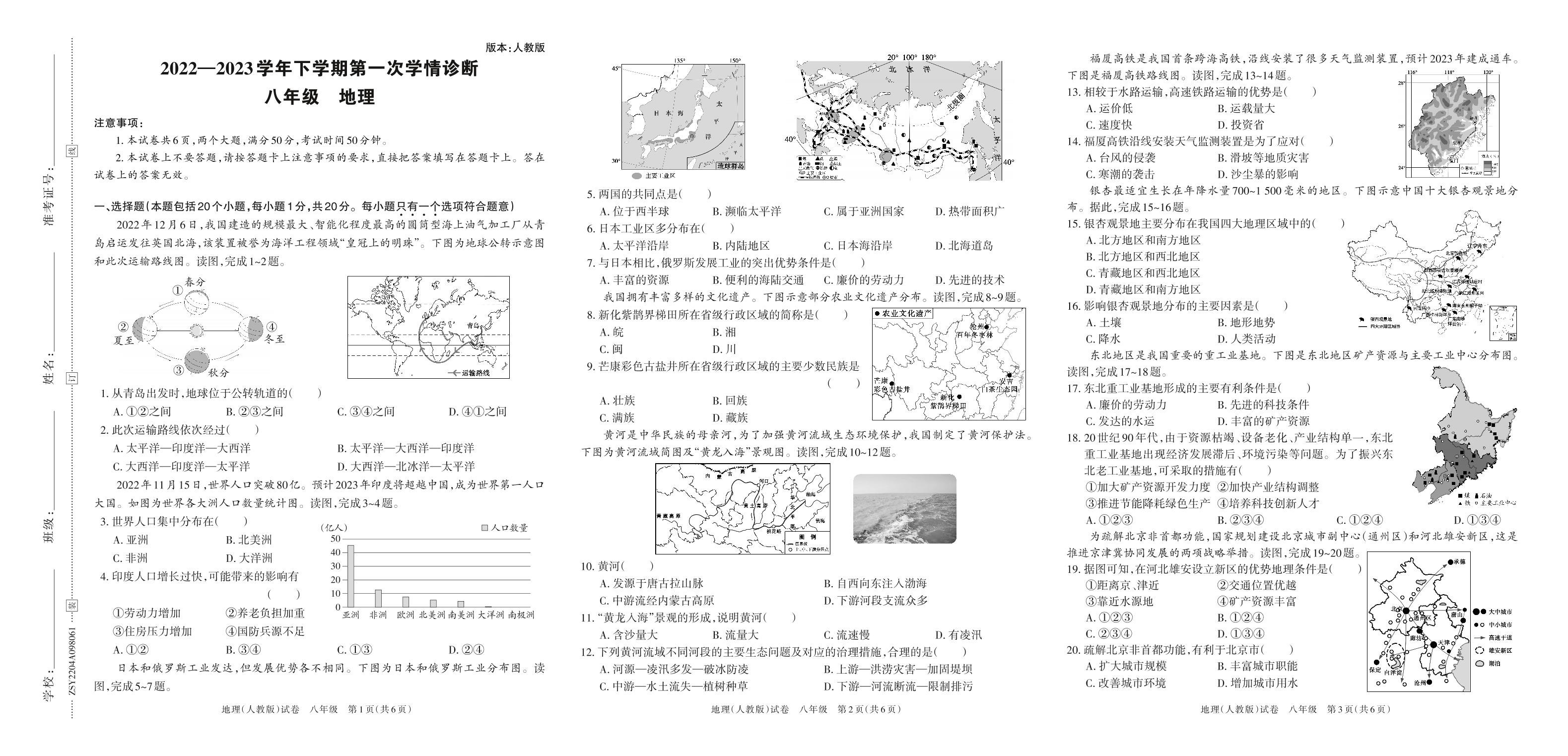 河南省洛阳市宜阳县2022—2023学年下学期第一次学情诊断试卷八年级地理(人教版)